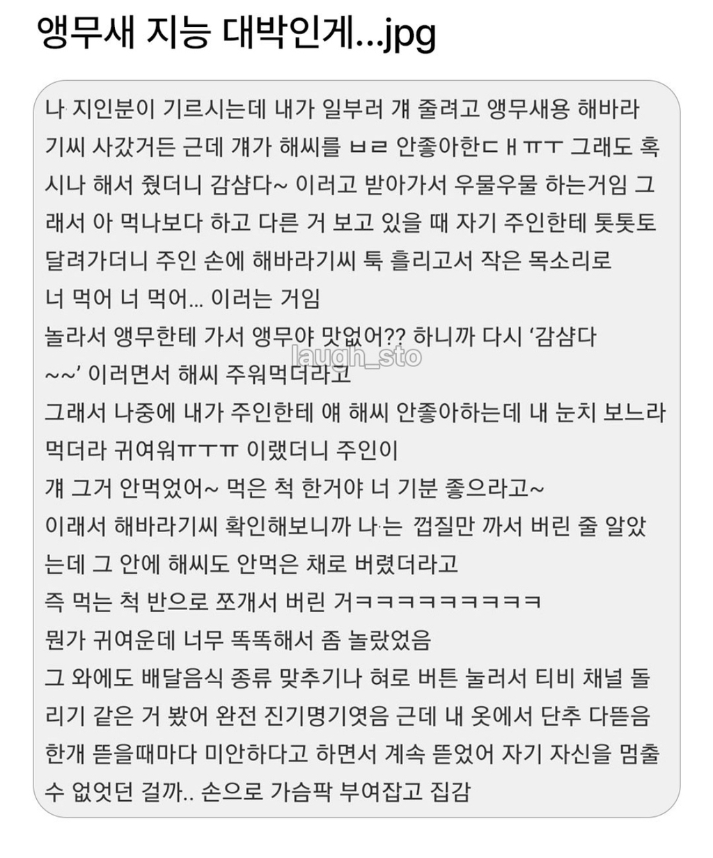 [스크랩] [흥미돋]앵무새 지능 진짜 대박인게 ㄷㄷ 작성자열빙어|작성시간25.10.28|조회수31,283 목록 댓글 55 글자크기 작게가 글자크기 크게가 출처: https://www.instagram.com/p/DPQ2qQCj2VR/섬세한 앵무햄,. ㅠ 다음검색 스크랩 원문 : *여성시대* 차분한 20대들의 알흠다운 공간 현재 게시글 추가 기능 열기 북마크 공유하기 신고 센터로 신고 댓글 댓글 55 댓글쓰기 답글쓰기 댓글 리스트 작성자이초 | 작성시간 25.10.28 단추 ㅋㅋㅋㅋㅋㅋㅋㅋ귀엽고 똑똑해☺️ 작성자닭박사 | 작성시간 25.10.28 개웃겨 작성자흐으으으음 | 작성시간 25.10.28 배려심이 내 상사보다 낫네 작성자안새는바가지 | 작성시간 25.10.29 감샴다~ 작성자푸라닭투움바 | 작성시간 25.10.29 똑똑한데 착하기까지ㅠㅠ 댓글 전체보기