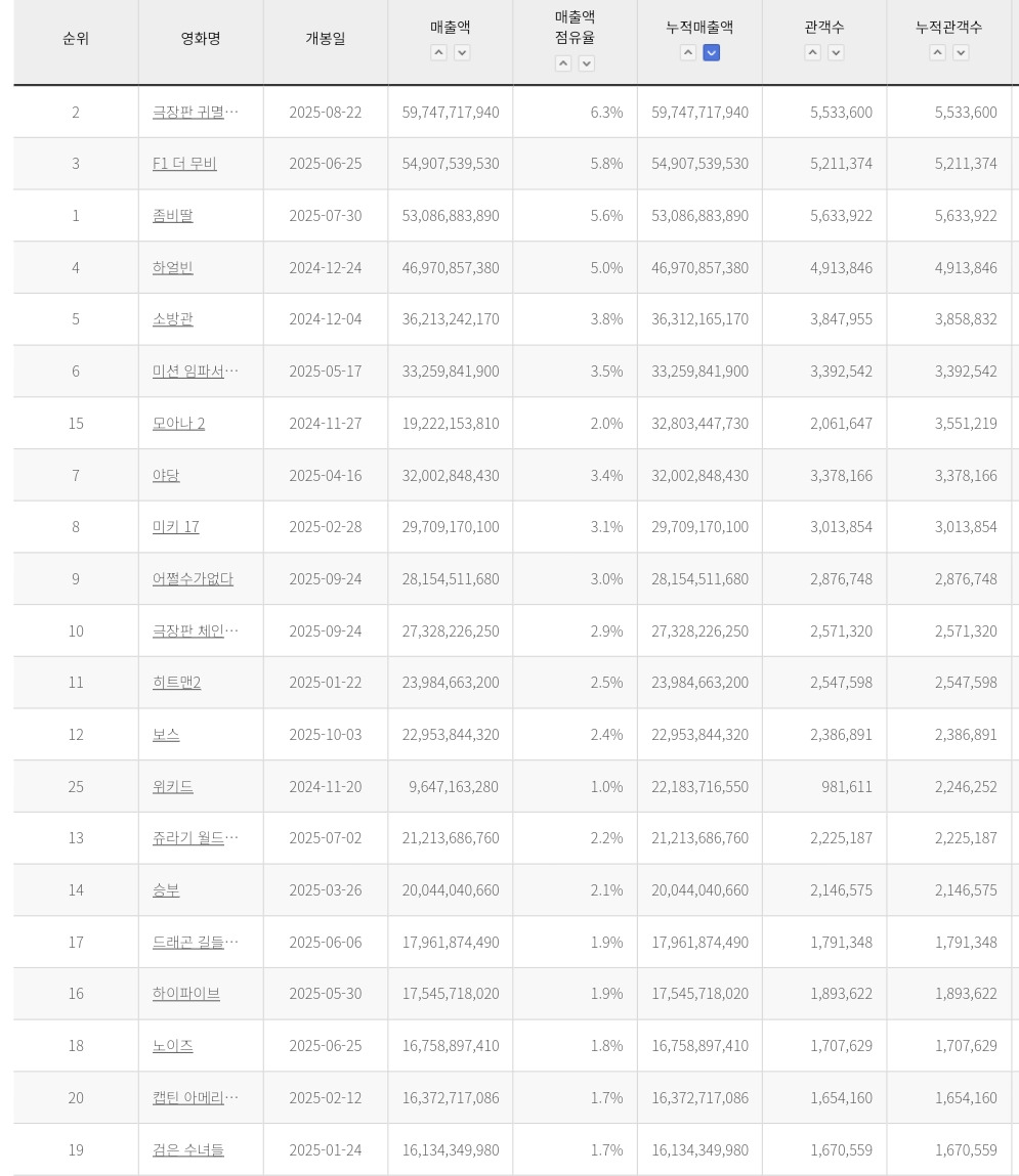 [흥미돋]2025년 한국 박스오피스 관객, 매출 순위.jpg 작성자복숭아집|작성시간25.10.28|조회수5,414 목록 댓글 1 글자크기 작게가 글자크기 크게가 출처: https://theqoo.net/square/3969491024 관객순 매출순 다음검색 현재 게시글 추가 기능 열기 북마크 공유하기 신고 센터로 신고 댓글 댓글 1 댓글쓰기 답글쓰기 댓글 리스트 작성자kiiikiii 이솔 | 작성시간 25.10.28 귀칼보다 하얼빈이 낮다니....에휴 댓글 전체보기