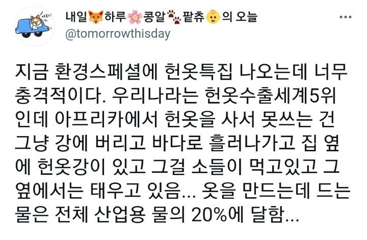 [스크랩] [흥미돋]지금 환경스페셜에 헌옷특집 나오는데 너무 충격적이다.twt 작성자코코밥쿠쿠|작성시간25.10.28|조회수7,374 목록 댓글 8 글자크기 작게가 글자크기 크게가 출처 : https://mobile.twitter.com/tomorrowthisday/status/1410568532643909632?s=19 다음검색 스크랩 원문 : *여성시대* 차분한 20대들의 알흠다운 공간 현재 게시글 추가 기능 열기 북마크 공유하기 신고 센터로 신고 댓글 댓글 8 댓글쓰기 답글쓰기 댓글 리스트 작성자격변과변화 | 작성시간 25.10.28 이래서 중고나 빈티지만 삼 걍 기업들 미친거같음 작성자lntj | 작성시간 25.10.28 그만사야함.. 작성자수숙 | 작성시간 25.10.28 하 그만사고싶은데 자꾸 찐다구요 ㅜ 작성자베네딕틴 | 작성시간 25.10.28 그래서 옷 잘 안삼 작성자호텔스컴바인 | 작성시간 25.10.29 진짜 심각해… 댓글 전체보기
