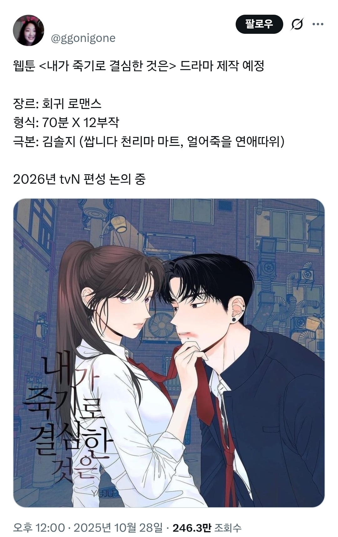 [흥미돋]웹툰 <내가 죽기로 결심한 것은> 드라마 제작 예정 작성자jwfqjt|작성시간25.10.28|조회수47,862 목록 댓글 210 글자크기 작게가 글자크기 크게가 출처: https://x.com/ggonigone/status/1983005837166862570 다음검색 현재 게시글 추가 기능 열기 북마크 공유하기 신고 센터로 신고 댓글 댓글 210 댓글쓰기 답글쓰기 댓글 리스트 작성자huntr/x | 작성시간 25.10.30 이거재밋나요 작성자머랏 | 작성시간 25.10.30 차결을 대체 누가맡냐고ㅠ 작성자스피또1등 | 작성시간 25.10.30 진짜 말도안돼... 차결을.... 작성자나참사타구니가없어서 | 작성시간 25.10.30 차결을 누가해 작성자띠융때융 | 작성시간 25.10.30 아그만좀 댓글 전체보기