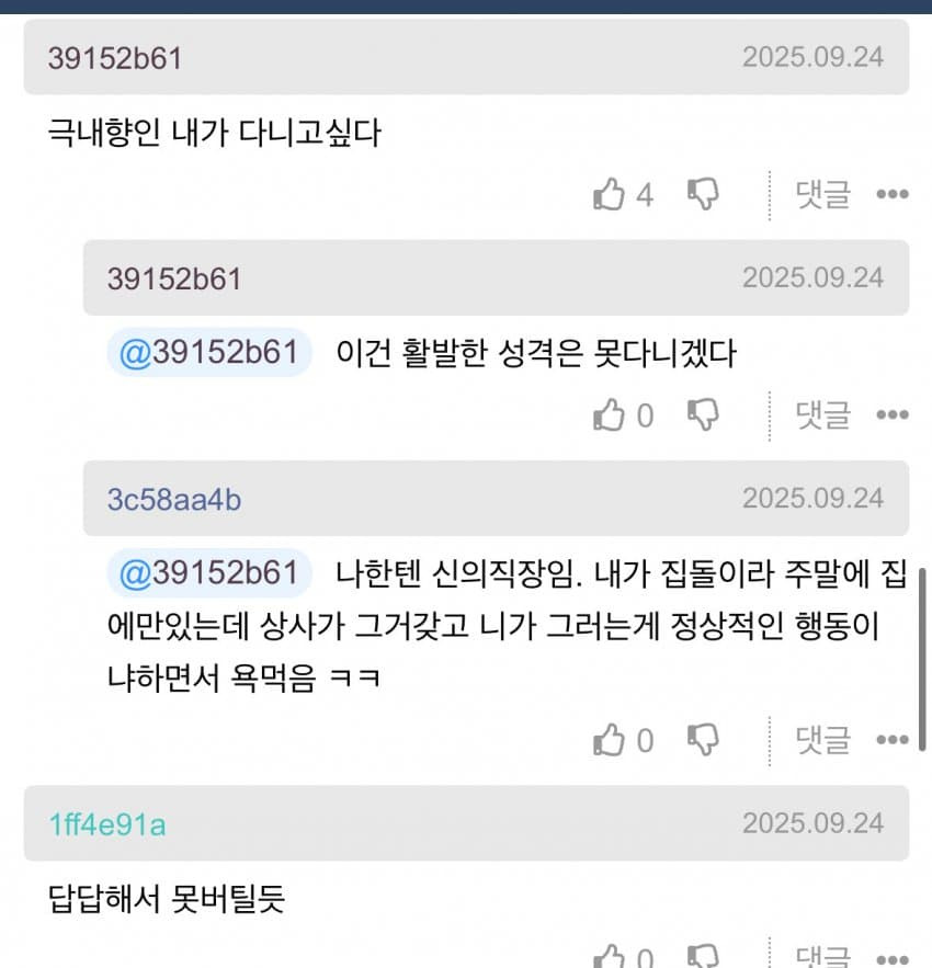 [흥미돋]회사 입사했는데 분위기가 이상함.jpg 작성자머리부터발끝까지한있슈|작성시간25.10.29|조회수125,302 목록 댓글 235 글자크기 작게가 글자크기 크게가 출처: https://theqoo.net/hot/3969805422 다음검색 현재 게시글 추가 기능 열기 북마크 공유하기 신고 센터로 신고 댓글 댓글 235 댓글쓰기 답글쓰기 댓글 리스트 작성자선서니 | 작성시간 25.11.03 ㅈㄴ좋음 주말에 뭐했는지 안궁금하고 지애 자랑 안듣고싶음ㅠㅠ 작성자둘리두 | 작성시간 25.11.03 부럽다.. 작성자혼자있을래 | 작성시간 25.11.04 저렇게까지 잡담 없는건 너무 불편해 작성자세일러 코스모스 | 작성시간 25.11.04 ㄹㅇ 망할것같은데;; 작성자뽀야아아 | 작성시간 25.11.05 진심 저런직장 걸릴때까지 이직한다 댓글 전체보기