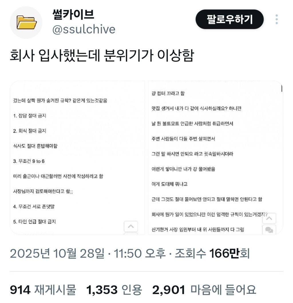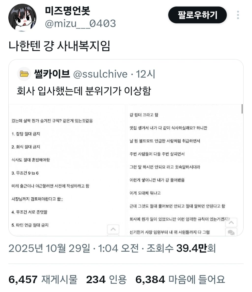 [스크랩] [흥미돋]나한텐 걍 사내복지임.x 작성자안나푸르나|작성시간25.10.29|조회수46,309 목록 댓글 105 글자크기 작게가 글자크기 크게가 출처: https://x.com/mizu___0403/status/1983203321134625261X의 미즈명언봇님(@mizu___0403)나한텐 걍 사내복지임x.com 다음검색 스크랩 원문 : 비공개카페 현재 게시글 추가 기능 열기 북마크 공유하기 신고 센터로 신고 댓글 댓글 105 댓글쓰기 답글쓰기 댓글 리스트 작성자뚱뚱땅땅 | 작성시간 25.10.29 개부러 하 작성자라라룰하 | 작성시간 25.10.29 이유라도 알려주면서 쉬쉬해라.. 작성자아 정말 곰도로스 인물이네요^^ | 작성시간 25.10.29 아니 정리해서 알려주라고 ㅋㅋㅋㅋ 작성자결혼해서행복하게사는건꼭나랑해 | 작성시간 25.10.30 감사합니다 작성자세인트 엑소시스트 | 작성시간 25.10.30 친목질때문에 파벌생기고 소외되는 사람들 생겨서 만든 룰인가보다 댓글 전체보기