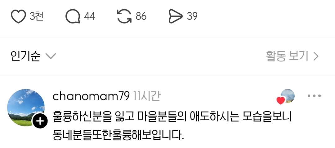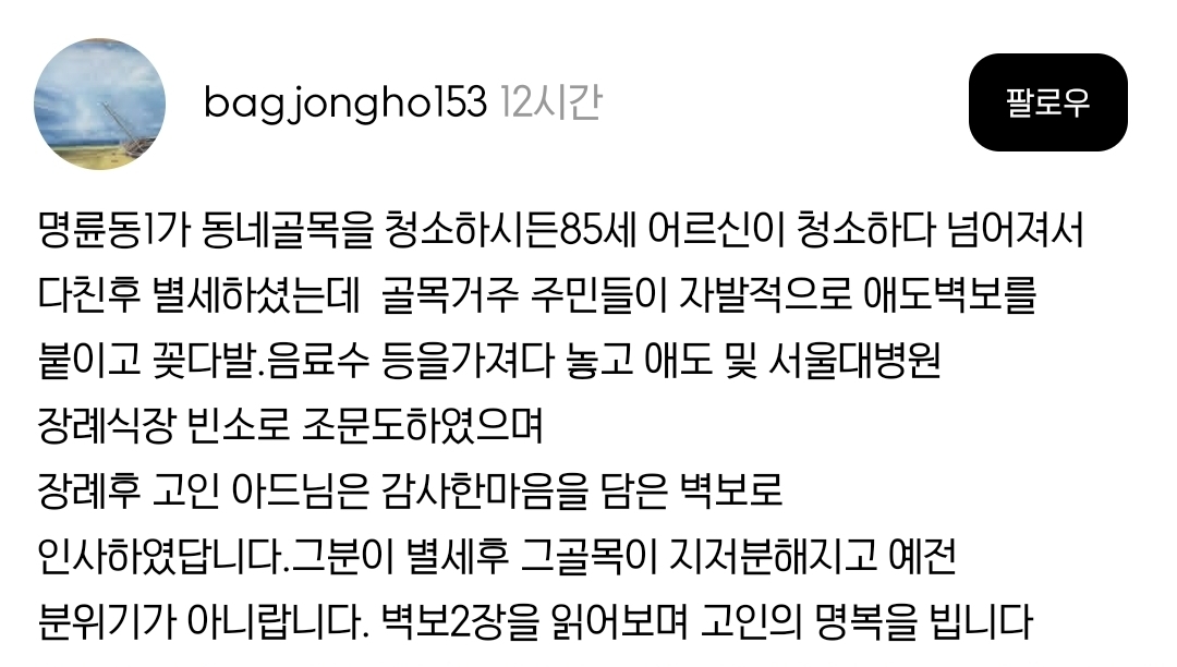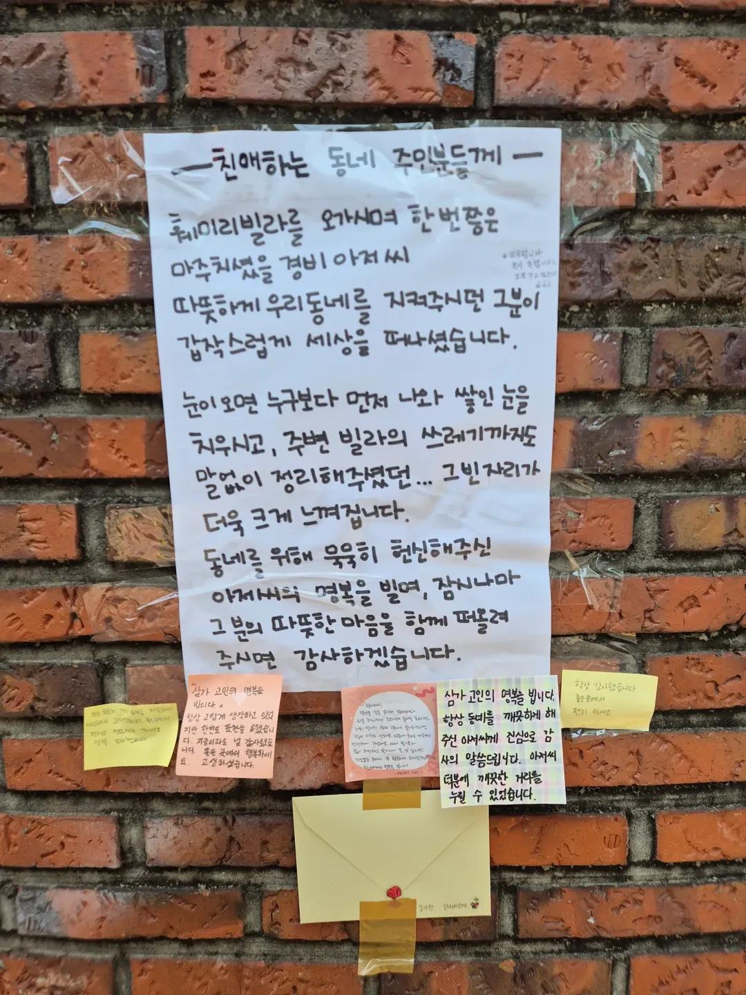[스크랩] [기타]감사한 이웃이 떠난 자리 작성자natural|작성시간25.10.29|조회수48,038 목록 댓글 27 글자크기 작게가 글자크기 크게가 출처: https://www.threads.com/@bagjongho153/post/DN10_540PIl?xmt=AQF0i8w5hJsT1Mbg5lhrNa05RXQ6hYgxAFJoFLgO4t6tvQ&slof=1 다음검색 스크랩 원문 : *여성시대* 차분한 20대들의 알흠다운 공간 현재 게시글 추가 기능 열기 북마크 공유하기 신고 센터로 신고 댓글 댓글 27 댓글쓰기 답글쓰기 댓글 리스트 작성자포포로리아 | 작성시간 25.10.29 ㅠㅠㅠ 눈물,, 작성자쫄만이 | 작성시간 25.10.29 일하는데 눈물 꽉 참는 중 작성자곽두팔의 오른팔 | 작성시간 25.10.29 눈물난다 정말ㅜㅜ 작성자과일몬스터 | 작성시간 25.10.29 ㅜㅠ인류애 다잃고 퇴근해서 충전.. 작성자고추씨봐라씨 | 작성시간 25.10.29 글이 다들 너무 예의바르고 따뜻하다.. 경비원분 좋은곳 가셧을듯 댓글 전체보기