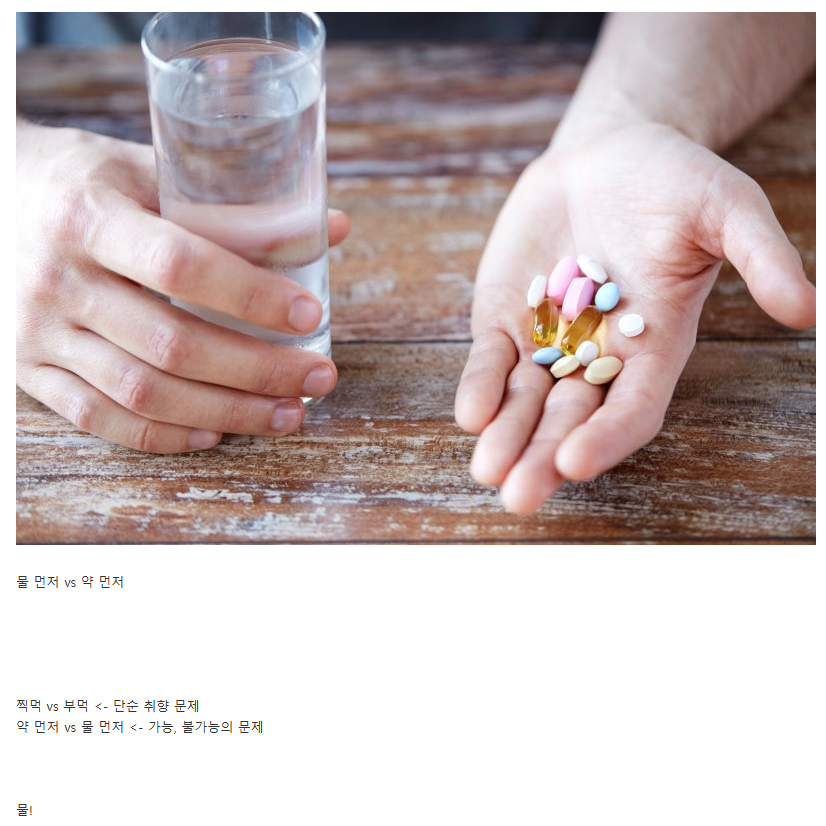 [흥미돋]사실상 부먹찍먹보다 더 심하게 갈리는 문제 작성자스크랩뿌리는여시|작성시간25.10.29|조회수26,207 목록 댓글 55 글자크기 작게가 글자크기 크게가 출처: https://theqoo.net/hot/3969588208?page=5더쿠 - 사실상 부먹찍먹보다 더 심하게 갈리는 문제물 먼저 vs 약 먼저 찍먹 vs 부먹 <- 단순 취향 문제 약 먼저 vs 물 먼저 <- 가능, 불가능의 문제 물!theqoo.net 다음검색 현재 게시글 추가 기능 열기 북마크 공유하기 신고 센터로 신고 댓글 댓글 55 댓글쓰기 답글쓰기 댓글 리스트 작성자김치김치만두 | 작성시간 25.10.29 난 항상 약 먼저. 물 먼저 먹는 사람들이 있단거 자체를 여시에서 처음 알았음 ㅋㅋㅋ 이거는 그냥 어렸을때부터 어떻게 먹어버릇 했냐만으로 갈리는 것인지? 작성자언뇽허삽나까... | 작성시간 25.10.29 약먼저 작성자미슬토 | 작성시간 25.10.29 약 종류에 따라 달라짐.. 작성자루마리 | 작성시간 25.10.29 물 작성자마빡어택 | 작성시간 25.10.30 물 왕창 가득 입에 넣고 고개 들고 약 넣고 꿀떡 하면 열알도 거뜬.. 댓글 전체보기