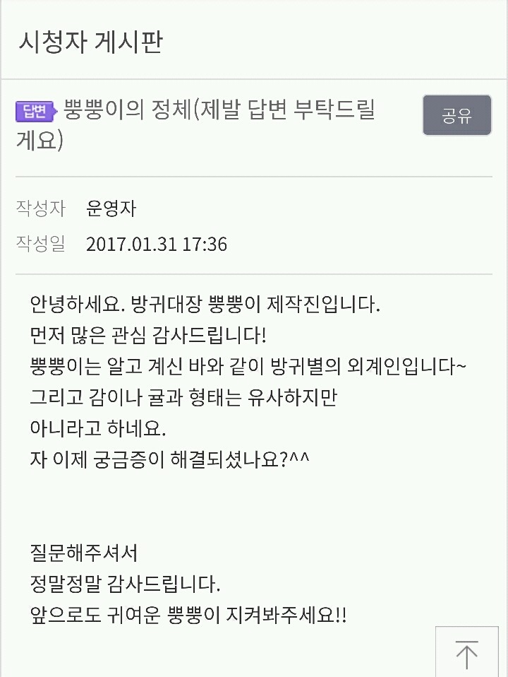[스크랩] [흥미돋]방귀대장 뿡뿡이의 정체는 무엇인가? 작성자돌연사 박물관|작성시간25.10.29|조회수5,728 목록 댓글 8 글자크기 작게가 글자크기 크게가 Q.뿡뿡이는 귤이냐vs감이냐?A.방귀별 외계인 입니다.뿡뿡이보고 감뚱땡이라고 헛소문 퍼뜨리지맙시다~[자료출처- EBS 방귀대장 뿡뿡이 시청자 게시판] 다음검색 스크랩 원문 : 엽기 혹은 진실 (세상 모든 즐거움이 모이는 곳) 현재 게시글 추가 기능 열기 북마크 공유하기 신고 센터로 신고 댓글 댓글 8 댓글쓰기 답글쓰기 댓글 리스트 작성자레몬딜버터 | 작성시간 25.10.29 감뿡이잔아 작성자10닐의전사 | 작성시간 25.10.29 감 먹으면 똥못싸는데 감일리가 없긴해 작성자부서지는 | 작성시간 25.10.29 종에 대해서 한번도 생각해본적이 없어 작성자We only said goodbye with words | 작성시간 25.10.29 성형중독이 제일심각한데 감인지 귤인지가 중요해? 작성자구글크롬하츠 | 작성시간 25.10.29 우연히 감이나 귤을 닮은거야? 방귀별의 외계인이? 댓글 전체보기