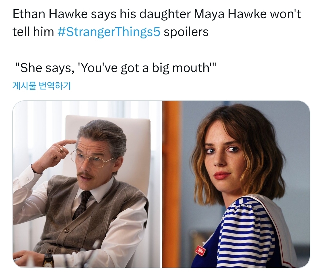 [스크랩] [흥미돋]에단 호크 : 딸한테서 스띵 시즌5 스포 단 하나도 못들었음 작성자다들 하는 것들 나도 할 수 있다|작성시간25.10.29|조회수14,436 목록 댓글 22 글자크기 작게가 글자크기 크게가 출처: 여성시대 eibsib아빠 입 싸다고 스포 1도 안가르쳐줌 ㅋㅋㅋㅋㅋ로빈이 에단호크 딸임 다음검색 스크랩 원문 : *여성시대* 차분한 20대들의 알흠다운 공간 현재 게시글 추가 기능 열기 북마크 공유하기 신고 센터로 신고 댓글 댓글 22 댓글쓰기 답글쓰기 댓글 리스트 작성자업뽀빔 | 작성시간 25.10.29 존웃ㅋㅋㅋㅋㅋㅋ 작성자김가입 | 작성시간 25.10.30 말하는거 개웃기네 ㅋㅋㅋㅋ 유브갓빅마우스 작성자라이트맥주만조진다 | 작성시간 25.10.30 헐? 에단호크 딸..! 작성자테무알리쿠팡 | 작성시간 25.10.30 에단호크 살아있었어??? 작성자씨름부넘버원 | 작성시간 25.12.01 ㅁㅊ에단호크딸이엇어??????? 댓글 전체보기