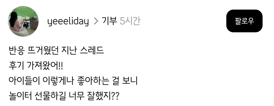 [스크랩] [흥미돋]명품 뭐 살지 한참 고민하다가 ⋯ 작성자다냐가|작성시간25.10.29|조회수61,112 목록 댓글 54 글자크기 작게가 글자크기 크게가 출처: https://www.threads.com/@yeeeliday/post/DQBoG7QExXj?xmt=AQF0NksU0dwDe-C155aQa_2JW94FKoBviUyGYX-xRF91Yw&slof=1이런 기부도 가능하구나넘 보람찰듯🥹+) 궁금해하는 기부금액 다음검색 스크랩 원문 : *여성시대* 차분한 20대들의 알흠다운 공간 현재 게시글 추가 기능 열기 북마크 공유하기 신고 센터로 신고 댓글 댓글 54 댓글쓰기 답글쓰기 댓글 리스트 작성자내가 사랑한 가을 | 작성시간 25.10.30 금액도 갠찮은데?? 저분 참 멋지다 작성자레몬아기냥냥이 | 작성시간 25.10.30 멋있다... 작성자마리를사또밥 | 작성시간 25.10.30 와 진짜 멋있다 마음이나 생각도 멋진데 실행한게 더 멋있음.. 생각은 해도 이것저것 알아보기 귀찮아서 관두는 사람도 많을텐데 작성자코코리리닝 | 작성시간 25.10.30 대단하다 작성자산독기독기야어디를가느냐~ | 작성시간 25.10.30 어떻게하는지도 좀 알려주세요.. 댓글 전체보기