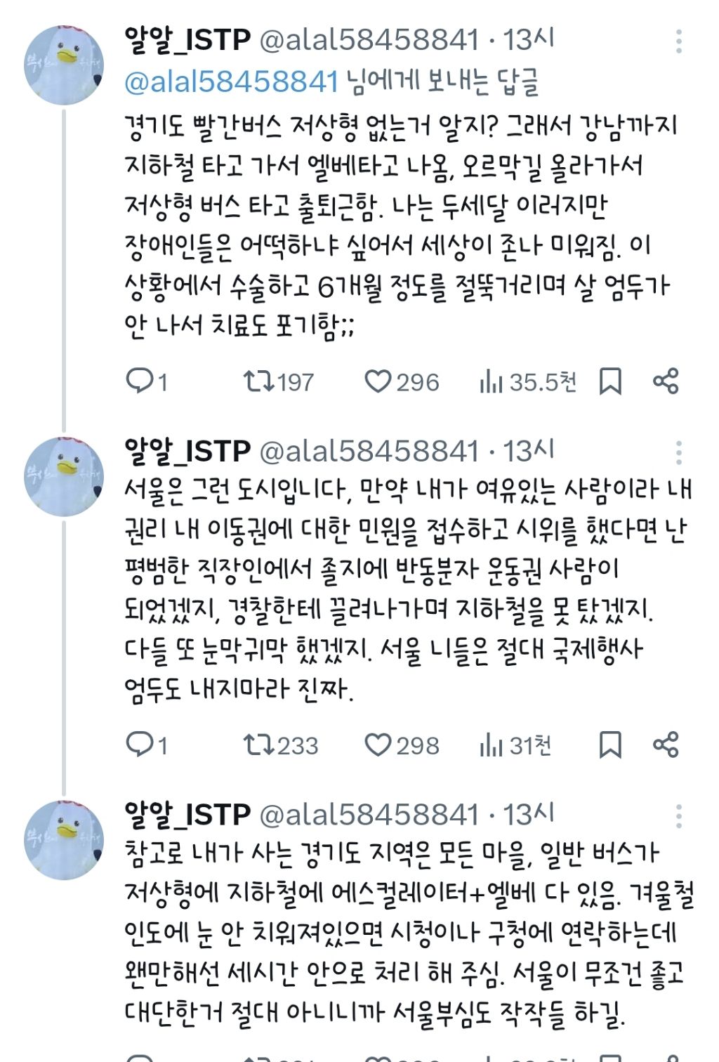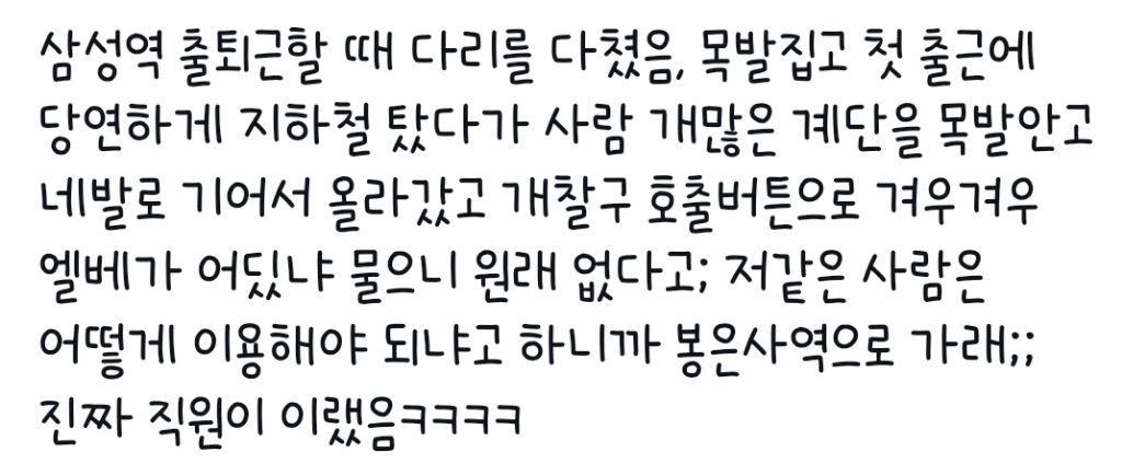 작성자아니잠깐만 작성시간 25.10.30 진심ㅋㅋㅋ나 최근에 발목 골절되서 반깁스하고 다녔는데 계단 존나 많고 엘베는 적고 에스컬레이터는 맨날 공사하고 지하철타면 사람들 진심 단 한 명도 자리 양보 안해줌ㅋㅋㅋ그리고 인도는 존나 울퉁불퉁 개지랄나있음