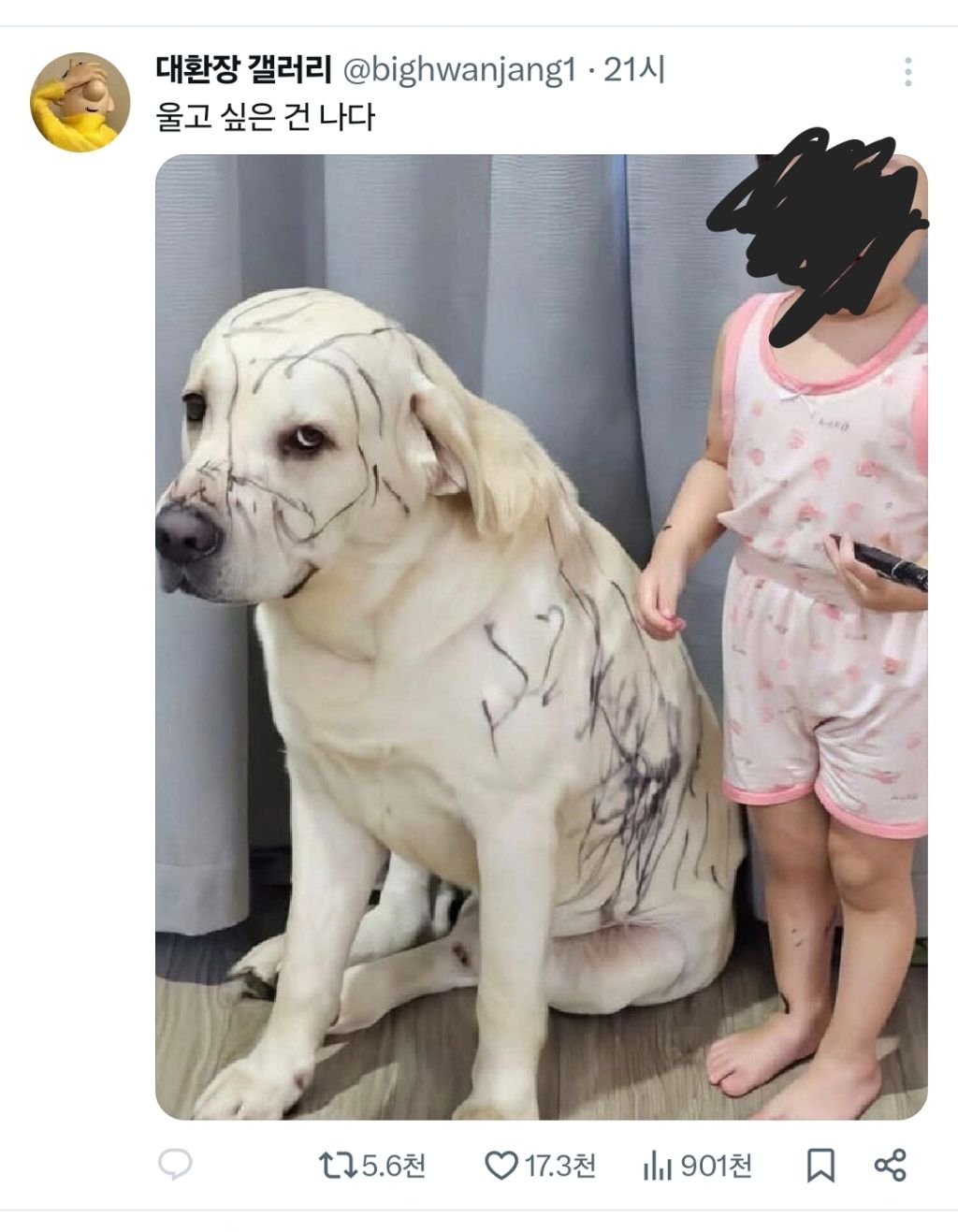 작성자성행합행 작성시간 25.10.30 이미 일은 저질러졌고 그 김에 사진 찍은거 같은데... 훈육을 한지 안한지는 모르니까 궁예할 필요 없을 거 같음. 설마 강아지한테 낙서하라고 시키고 지켜봤겠어...? 설마...?