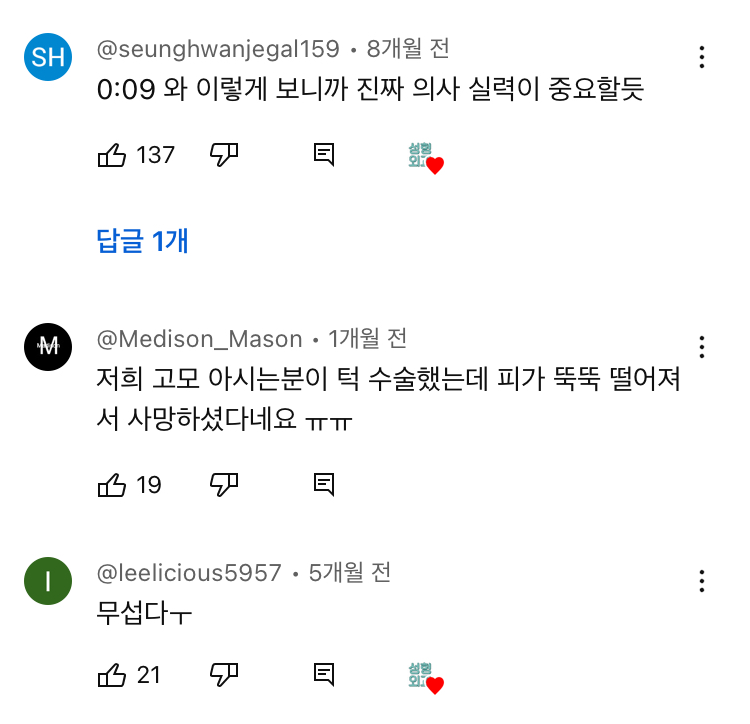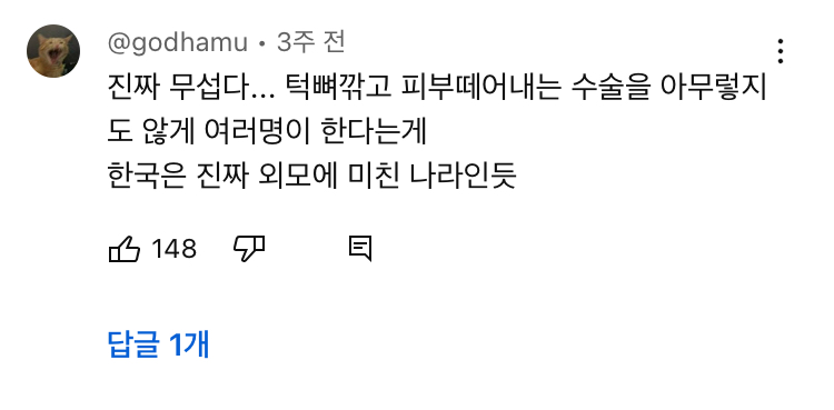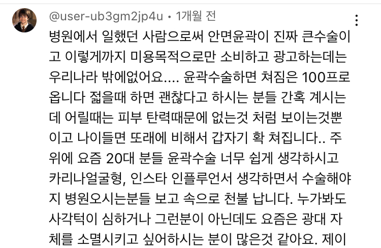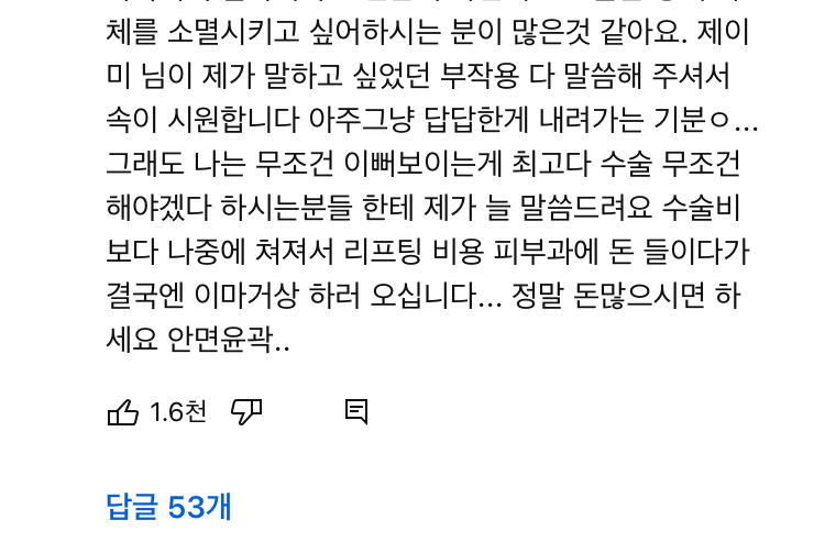 위에 영상 댓글(영상 내용은 안면윤곽 후 살처짐 때문에 엄청 고생하고 몇천 썼다는 내용 근데 후회는 안 하신다고 함)