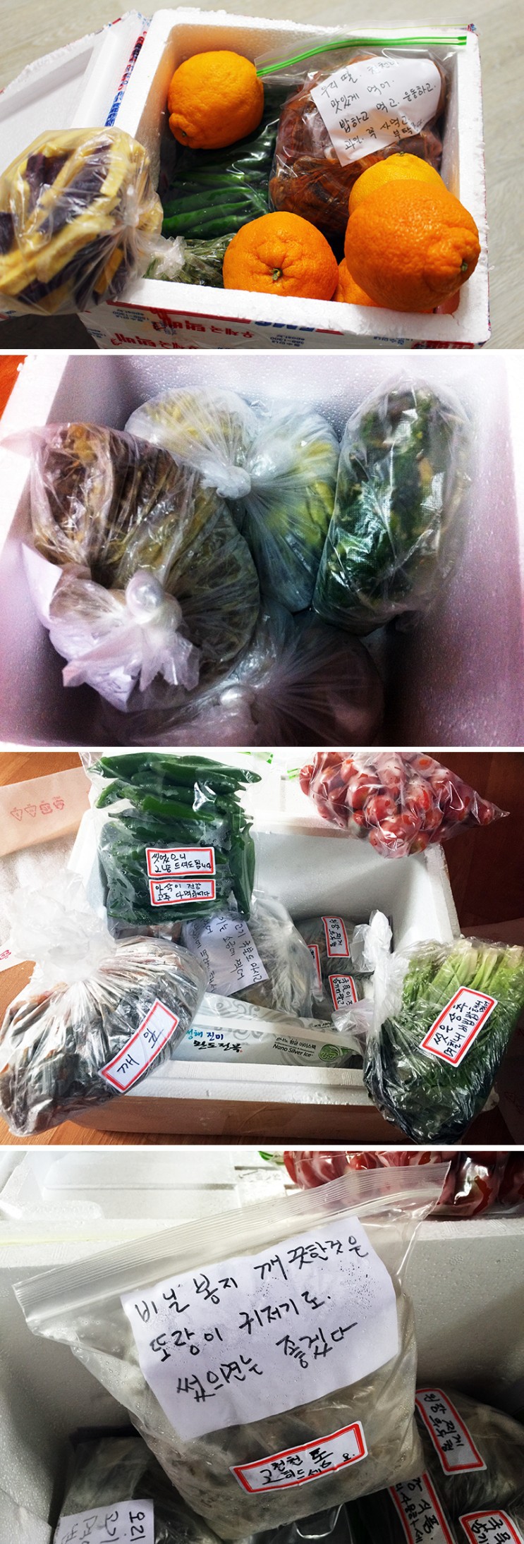 각종 쌈나물과 채소, 심지어 마늘과 고추도 한끼 분량으로 소분하여 지퍼락에 담겨져 있다.