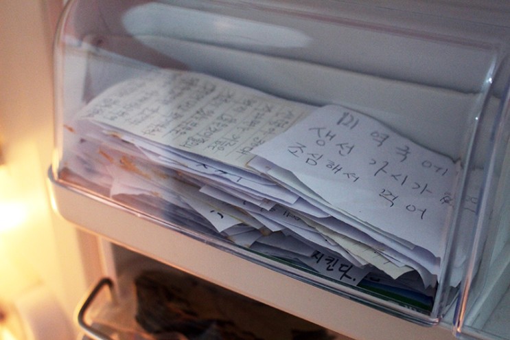 잔소리 쪽지는 한장도 버리지 않고 냉장고 수납칸에 차곡차곡 모아두고 있다.