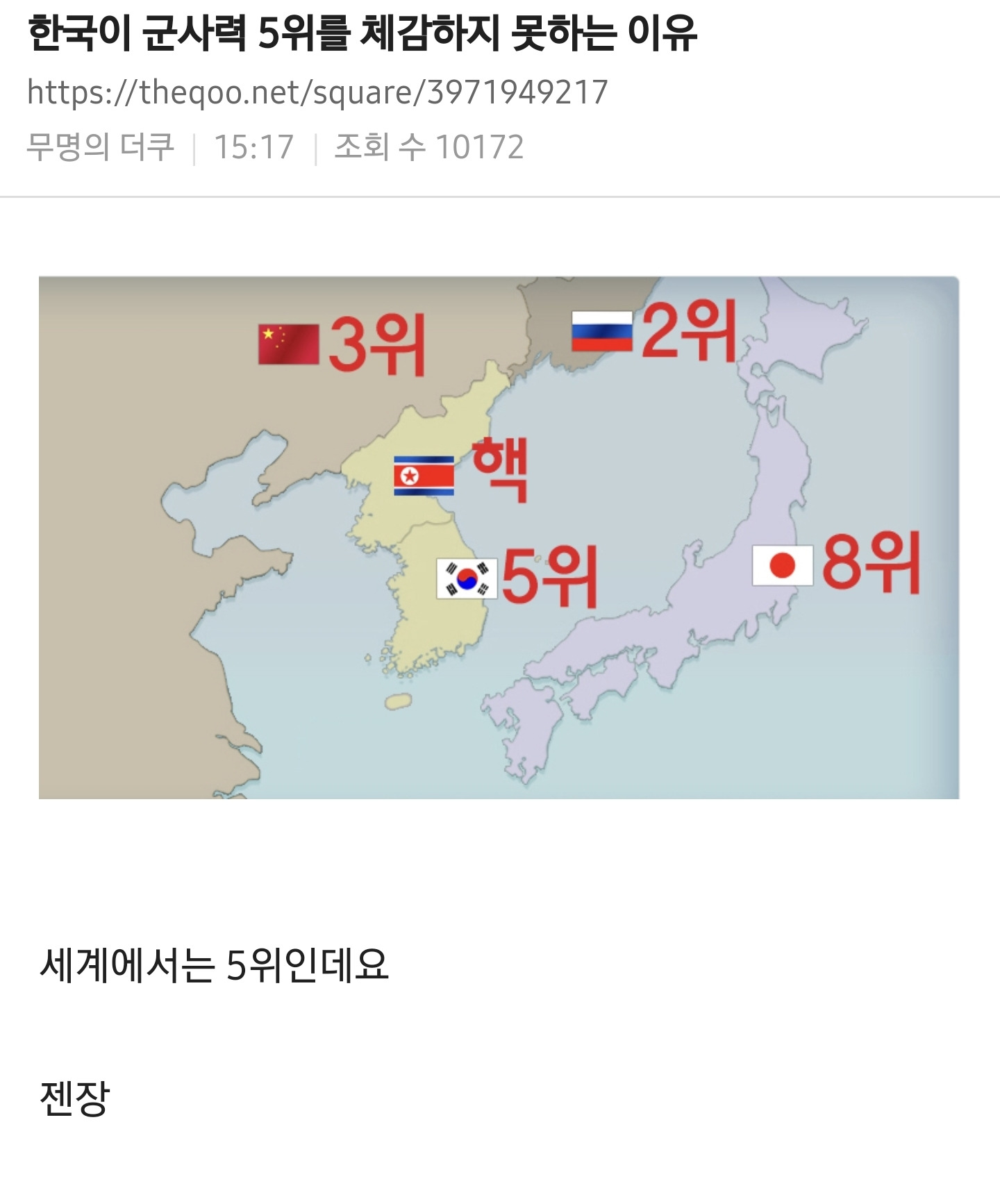 [흥미돋]한국이 군사력 5위를 체감하지 못하는 이유 작성자Sunmoonstar02|작성시간25.10.30|조회수22,388 목록 댓글 65 글자크기 작게가 글자크기 크게가 출처: https://theqoo.net/square/3971949217더쿠 - 한국이 군사력 5위를 체감하지 못하는 이유여기를 눌러 링크를 확인하세요theqoo.net전세계 5위인데 반에서 꼴찌..? 다음검색 현재 게시글 추가 기능 열기 북마크 공유하기 신고 센터로 신고 댓글 댓글 65 댓글쓰기 답글쓰기 댓글 리스트 작성자흠냥냥 | 작성시간 25.10.30 아..우리나라 개쩌네?? 작성자설ving | 작성시간 25.10.30 하 이제 단군할배에게 화가 나 작성자빼뇽삐 | 작성시간 25.10.30 인도 쎄네?? 작성자더손놈 | 작성시간 25.10.30 어떻게 정하는 거지? 작성자세인트 엑소시스트 | 작성시간 25.10.31 그와중에 일본 이겼다 ㅋㅋㅋㅋㅋㅋㅋㅋ 댓글 전체보기