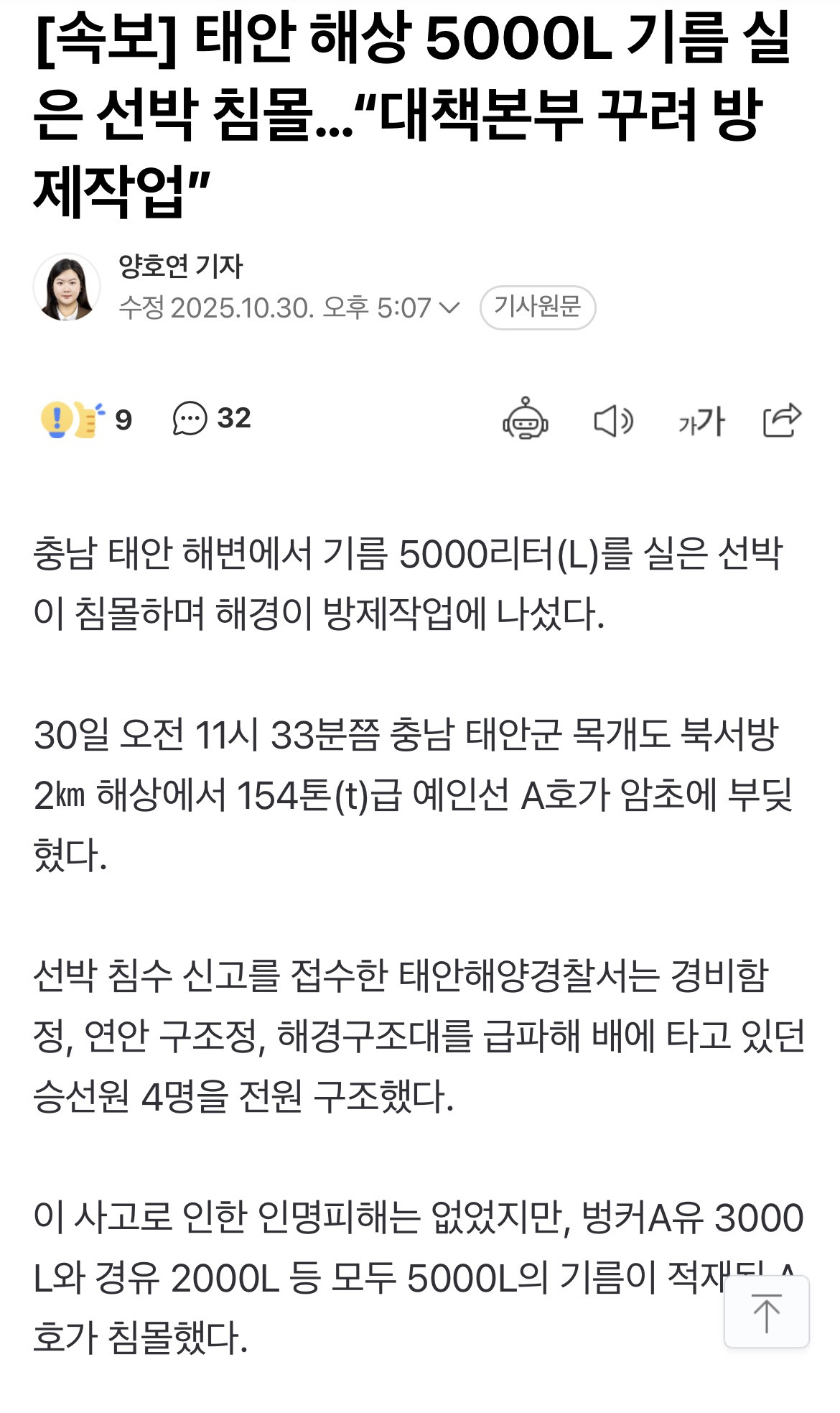 [여시뉴스데스크]속보] 태안 해상 5000L 기름 실은 선박 침몰…“대책본부 꾸려 방제작업”