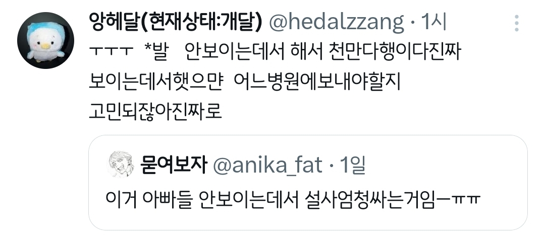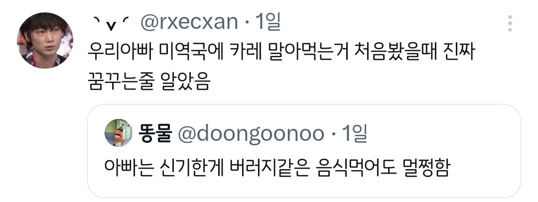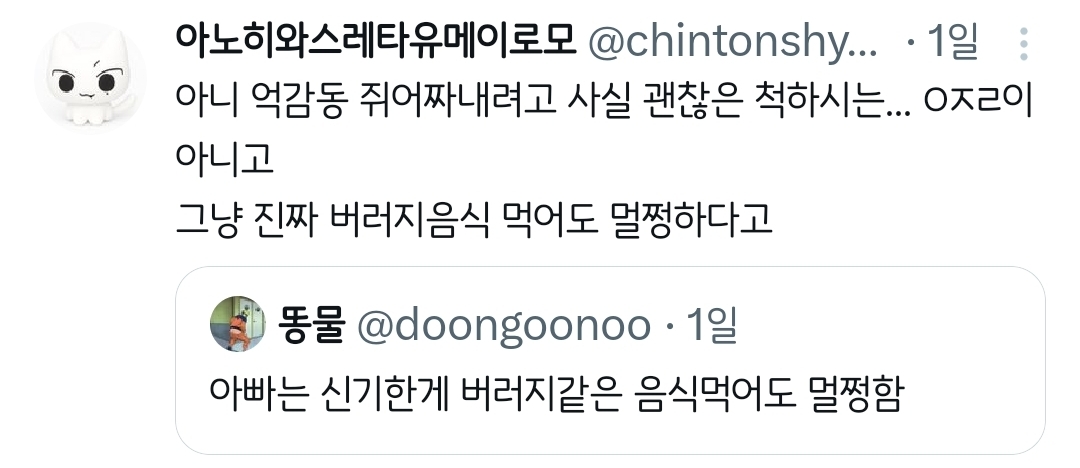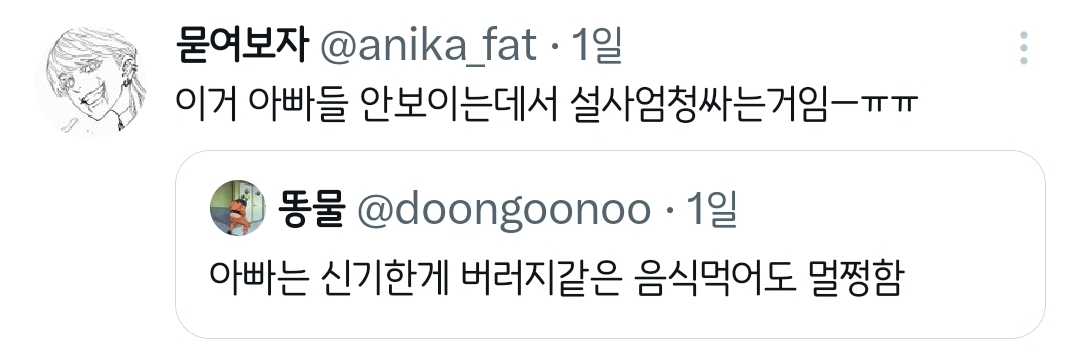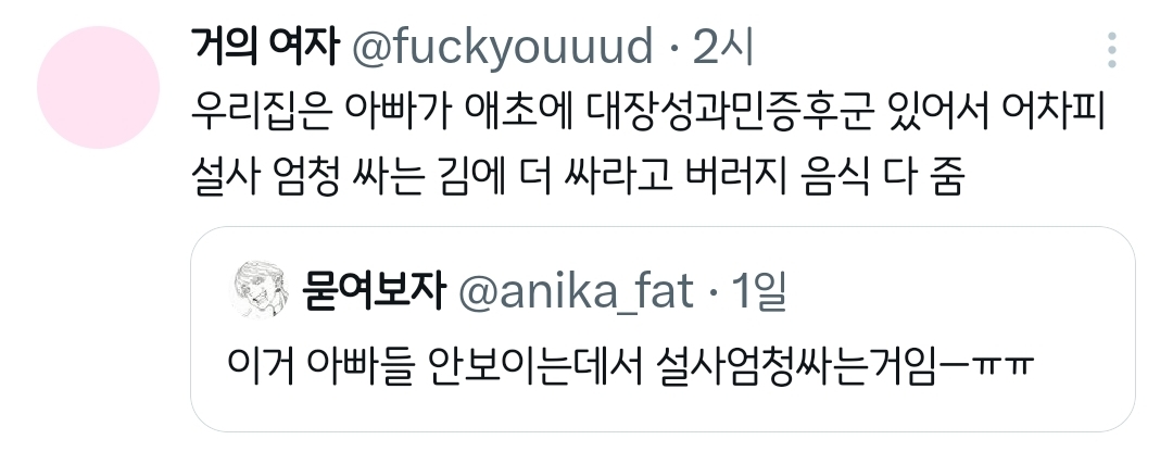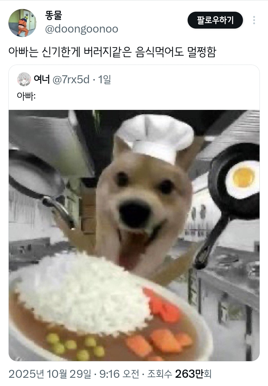[흥미돋]아빠는 신기한게 버러지같은 음식먹어도 멀쩡함.twt 작성자튜브스크리머|작성시간25.10.30|조회수25,786 목록 댓글 50 글자크기 작게가 글자크기 크게가 출처: 여성시대 튜브스크리머https://x.com/doongoonoo/status/1983326958659440659?t=5Fpvt_ULl22NMF6Kxtk0WQ&s=19 다음검색 현재 게시글 추가 기능 열기 북마크 공유하기 신고 센터로 신고 댓글 댓글 50 댓글쓰기 답글쓰기 댓글 리스트 작성자POPOS2 | 작성시간 25.10.31 아빠 비빔밥에 초코파이넣어서 괴식드심 작성자가을무존맛 | 작성시간 25.10.31 울갭은 음식냄새만맡아도 배불러하고 뷔페가도 두접시이상 못먹어서 내가 버러지담당임 삭제된 댓글입니다. 답댓글 작성자운동하라고말해줘 | 작성시간 25.11.01 아 간단한 설사 오랜만에 보는데 개웃기다 ㅋㅋㅋㅋㅋㅋㅋㅋㅋㅋㅋㅋㅋㅋㅋㅋㅋㅋㅋㅋㅋㅋㅋㅋㅋㅋㅋ 작성자저녁없는삶 | 작성시간 25.10.31 먹기 싫은거 걍 아빠 주면 아깝다고 다 먹음; 댓글 전체보기
