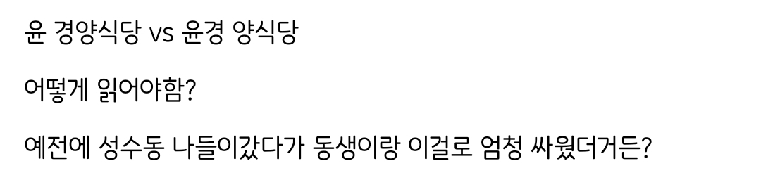 [흥미돋]윤경양식당 어떻게 읽어야함? 작성자꿈돌이라면|작성시간25.10.30|조회수45,457 목록 댓글 55 글자크기 작게가 글자크기 크게가 출처: https://www.threads.com/@salad_mk/post/DQaxTiaCVQ5?xmt=AQF0gNzP3bK1ZzcTTt2tkE8fSqbSZESknuZ8GcgJfdHMRQ&slof=1정답은 댓글에 다음검색 현재 게시글 추가 기능 열기 북마크 공유하기 신고 센터로 신고 댓글 댓글 55 댓글쓰기 답글쓰기 댓글 리스트 작성자초코초코촠 | 작성시간 25.10.31 윤 경양식당..? 작성자ghkjm | 작성시간 25.10.31 윤경양식 당 작성자제시카 알바 | 작성시간 25.10.31 윤경양 식당 작성자도르래 | 작성시간 25.10.31 윤경양씨가 운영하는 경양식 식당? 작성자코기코기롤 | 작성시간 25.10.31 지나갈때마다 윤 경양식당인줄 댓글 전체보기
