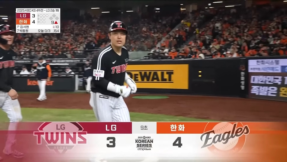 9회초, 스코어는 1:4, 선두타자는 볼넷 출루한 상황