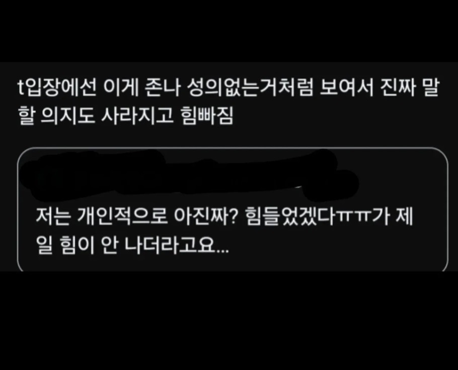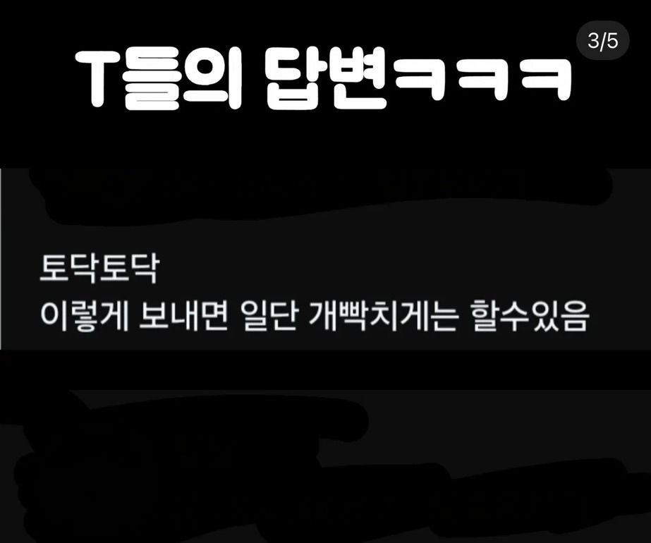 [스크랩] [배꼽의행방]t들은 긁히는 말 ㅋㅋㅋㅋㅋㅋㅋ 작성자aaaaaaal|작성시간25.10.31|조회수66,246 목록 댓글 172 글자크기 작게가 글자크기 크게가 출처: 여성시대 안녕하세요를리t 친구한테 물었더니 토닥토닥이 제일 빡친대일단 자존심이 상하고 급 무능력+징징이 된 기분이라 정신 번쩍 들게해준다 함ㅋㅋ ㅋ그래서 다른 의미로 도움? 된대ㅋㅋㅋㅋㅋ난 찐f라서 텍스트로 토닥토닥 하는거 위로도 되고 내가 할때도 진심으로 하는말인데ㅠㅋㅋㅋㅋ토닥토닥 <- 이거 t들한테는 긁히는말인게 개웃겨t와 f의 관계는 서로가 진심일수록더 환장해 하는듯ㅋㅋㅋㅋㅋㅋㅋㅋㅋ 다음검색 스크랩 원문 : *여성시대* 차분한 20대들의 알흠다운 공간 현재 게시글 추가 기능 열기 북마크 공유하기 신고 센터로 신고 댓글 댓글 172 댓글쓰기 답글쓰기 댓글 리스트 작성자부끄러워 | 작성시간 25.11.01 빡치진 않고 걍 내 고민 들어줄만한 여유가 없나보다 싶을듯 작성자스킨답서스에요 | 작성시간 25.11.01 찐으로 그냥 귀찮아서, 그만 징징거려, 듣기싫어 이런 의미가 아니라고????? 이게 너무 충격인데 작성자띵낑 | 작성시간 25.11.01 나도 해결법이 더 빡치는듯? 내가 안해봤을까?ㅜ 작성자아이돌 | 작성시간 25.11.01 힘내.. 라고 하면 더 빡쳐.. 작성자깜고냥이 | 작성시간 25.11.01 에공..ㅠ 힘내ㅠㅠ 토닥토닥.. 댓글 전체보기
