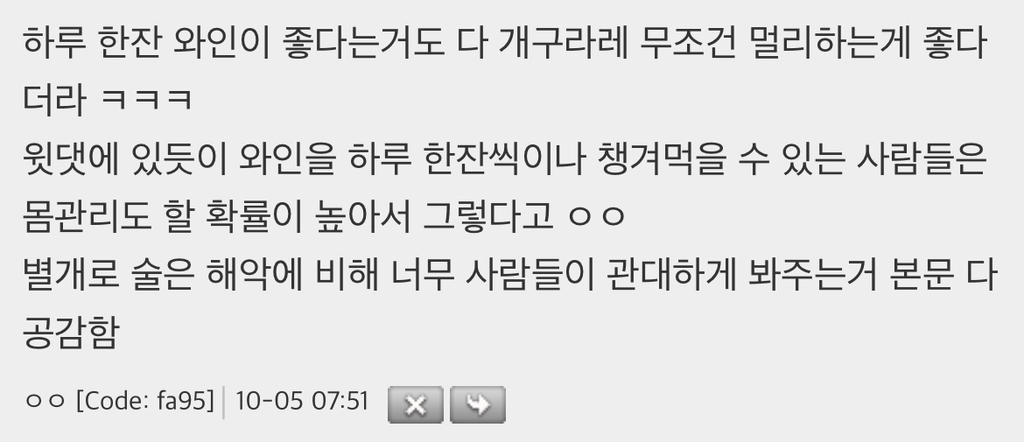 작성자록히드마틴 작성시간 25.10.31 나도 이게 마약이었으면 난 이미 뒤졌다고 생각함... 술은 정말 줄여야해 아니 안마시는게 가장 좋지. 한창 오래 술 쉴때 컨디션 개좋았는데...