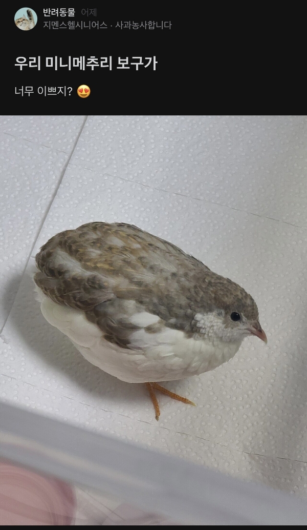 [스크랩] [흥미돋]블라인드) 우리 미니메추리 보구가 작성자열빙어|작성시간25.10.31|조회수30,380 목록 댓글 44 글자크기 작게가 글자크기 크게가 출처: 여성시대 (깍깍뚜루두) 다음검색 스크랩 원문 : *여성시대* 차분한 20대들의 알흠다운 공간 현재 게시글 추가 기능 열기 북마크 공유하기 신고 센터로 신고 댓글 댓글 44 댓글쓰기 답글쓰기 댓글 리스트 작성자기상호. | 작성시간 25.10.31 작고소중•• 작성자노으을 | 작성시간 25.10.31 무정란이라 먹어도 됨 작성자이번주 로또1등 나임 | 작성시간 25.10.31 귀엽다 ㅠ 작성자내정뵈최기홰 | 작성시간 25.10.31 ㅋㅋㅋ후라이작은거ㅜㅠㅠㅠㅠ 작성자교촌오리 | 작성시간 25.11.01 뚱쭝추리 댓글 전체보기