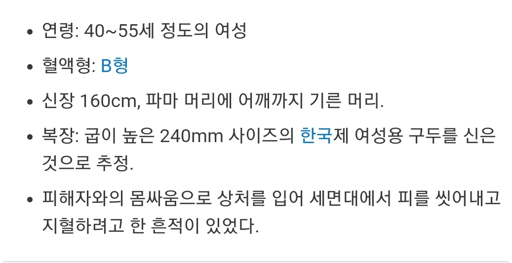 또한 화장실 세면대에서 찾은 혈흔의 혈액형은 B형이었는데