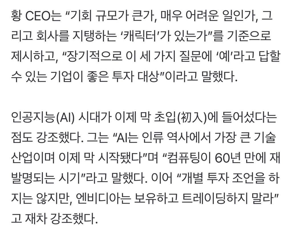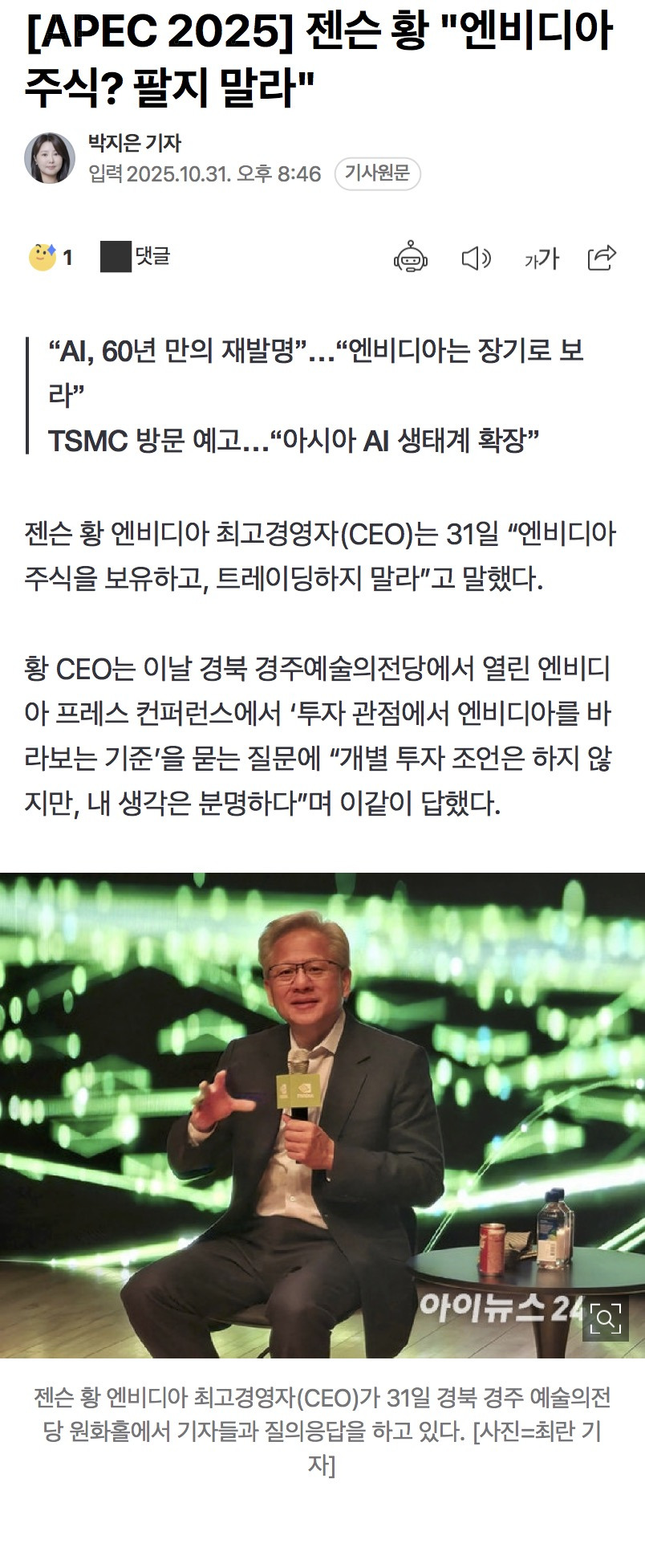 [여시뉴스데스크]젠슨 황 "엔비디아 주식? 팔지 말라" 작성자머리부터발끝까지한있슈|작성시간25.10.31|조회수27,259 목록 댓글 154 글자크기 작게가 글자크기 크게가 출처: https://n.news.naver.com/mnews/article/031/0000977103?sid=001 다음검색 현재 게시글 추가 기능 열기 북마크 공유하기 신고 센터로 신고 댓글 댓글 154 댓글쓰기 답글쓰기 댓글 리스트 작성자행복건강하자 | 작성시간 25.11.01 우와 작성자뉴트 스캐맨더 | 작성시간 25.11.01 네 작성자조니실버핸드 | 작성시간 25.11.02 례 작성자압둘라여시 | 작성시간 25.11.02 사요? 작성자부앵노스 | 작성시간 25.11.02 례 댓글 전체보기