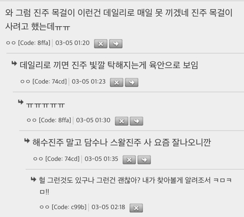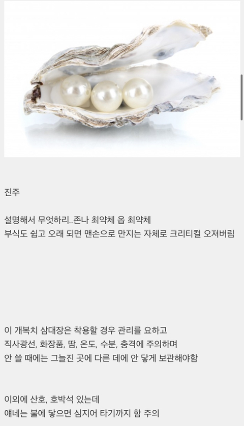 작성자뭉언니 작성시간 25.11.01 와 진주팔찌 그래사 색 탁해진거였구나….! 매일끼거다녓더니 색 탁해져서 이상하다생각햇엇어ㅜㅜㅜㅠ
