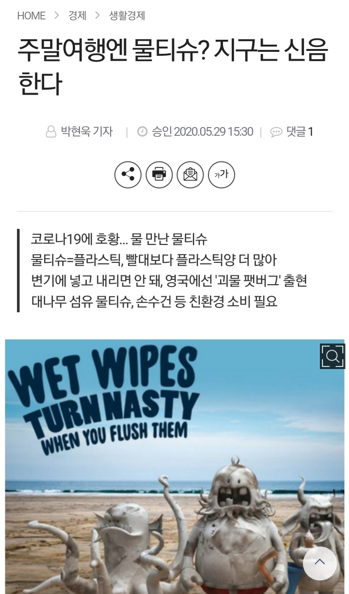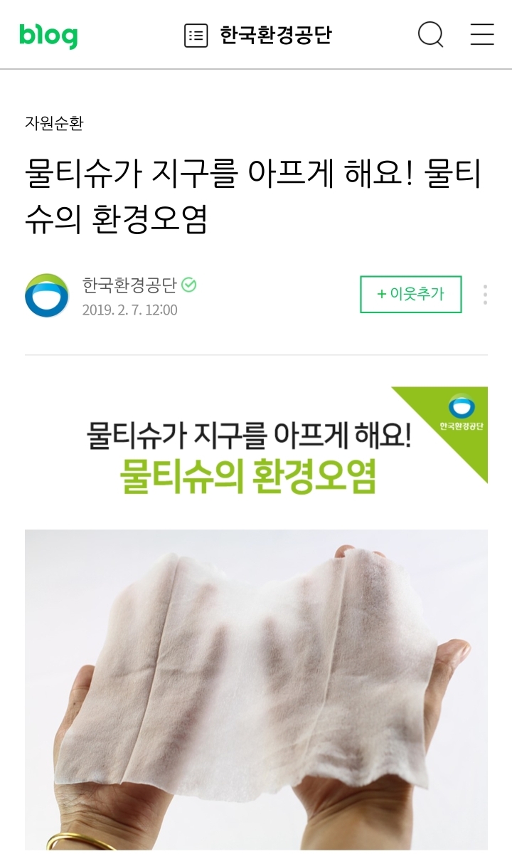 물티슈가 환경오염에 주범이란얘기를 어디서 주워듣고 안쓰려고 노력중인데ㅠ 주변에말해도 진짜? 라는반응이 많아 널리알리려고 캡쳐까지해옴 하나는 블로그,하나는 기사야! 블로그는 한국환경공단꺼니 블로그홍보 이런거아님