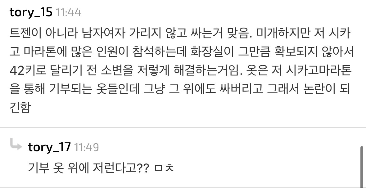 [흥미돋]마라톤 출발하기 전 소변보는 사람들 작성자Sunmoonstar02|작성시간25.11.01|조회수101,241 목록 댓글 209 글자크기 작게가 글자크기 크게가 출처: https://www.dmitory.com/issue/386912004이슈/유머 - 마라톤 출발하기 전 소변보는 사람들익명 정보 커뮤니티 사이트www.dmitory.com 다음검색 현재 게시글 추가 기능 열기 북마크 공유하기 신고 센터로 신고 댓글 댓글 209 댓글쓰기 답글쓰기 댓글 리스트 작성자28991 | 작성시간 25.11.02 네? 작성자SuperENTP | 작성시간 25.11.02 진짜 미개하다 작성자아이돌 | 작성시간 25.11.02 와 미친 작성자랭치치 | 작성시간 25.11.04 헐 작성자whyranosaurus | 작성시간 25.11.09 남녀 다 서서싸네 댓글 전체보기