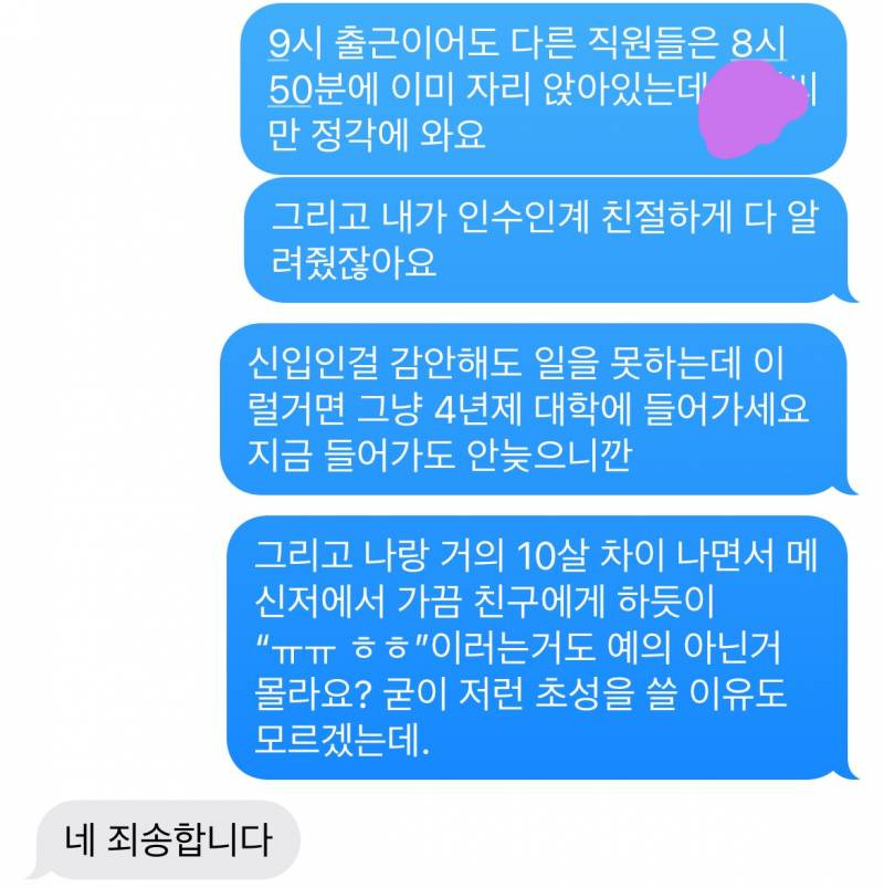일을 진짜 너무 못해서 충고했는데 답장 저렇게 띡 옴ㅋㅋㅋ 요즘 애들 ㄹㅇ 장난아니네