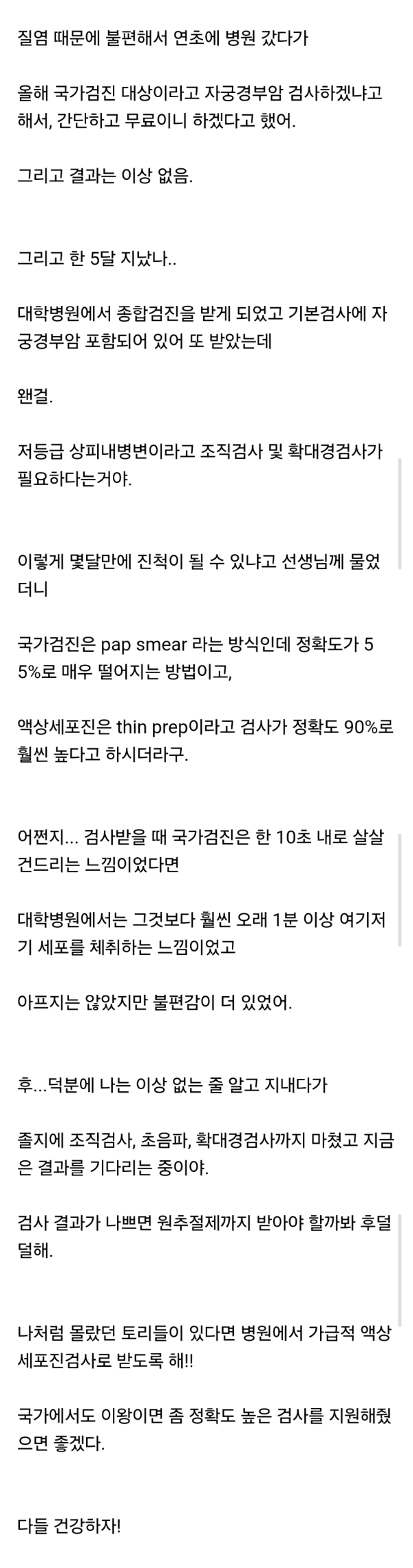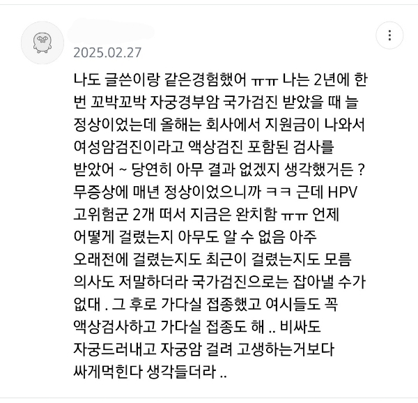 작성자이번에도 콩쥐가 이겨 작성시간 25.11.02 뭐지..이글.. 자궁경부암 국가검진 정확도 개높은데 거기서 1차로 걸러내고 문제있으면 2차로 씬프렙으로 넘어기는검사하는거야 글구 hpv는 완치가 없는건디
