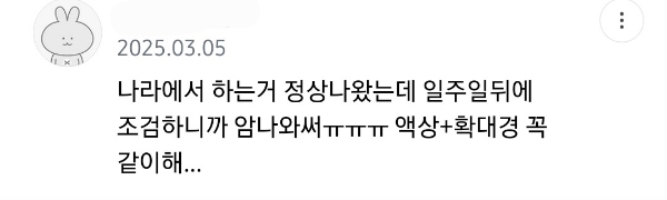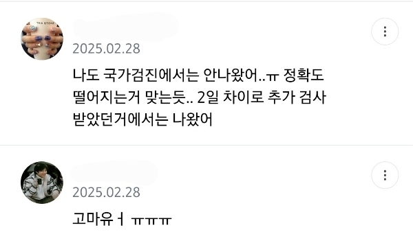 답댓글 작성자이번에도 콩쥐가 이겨 작성시간 25.11.02 문제가있다면 의사가 채취를 잘못햇겟지