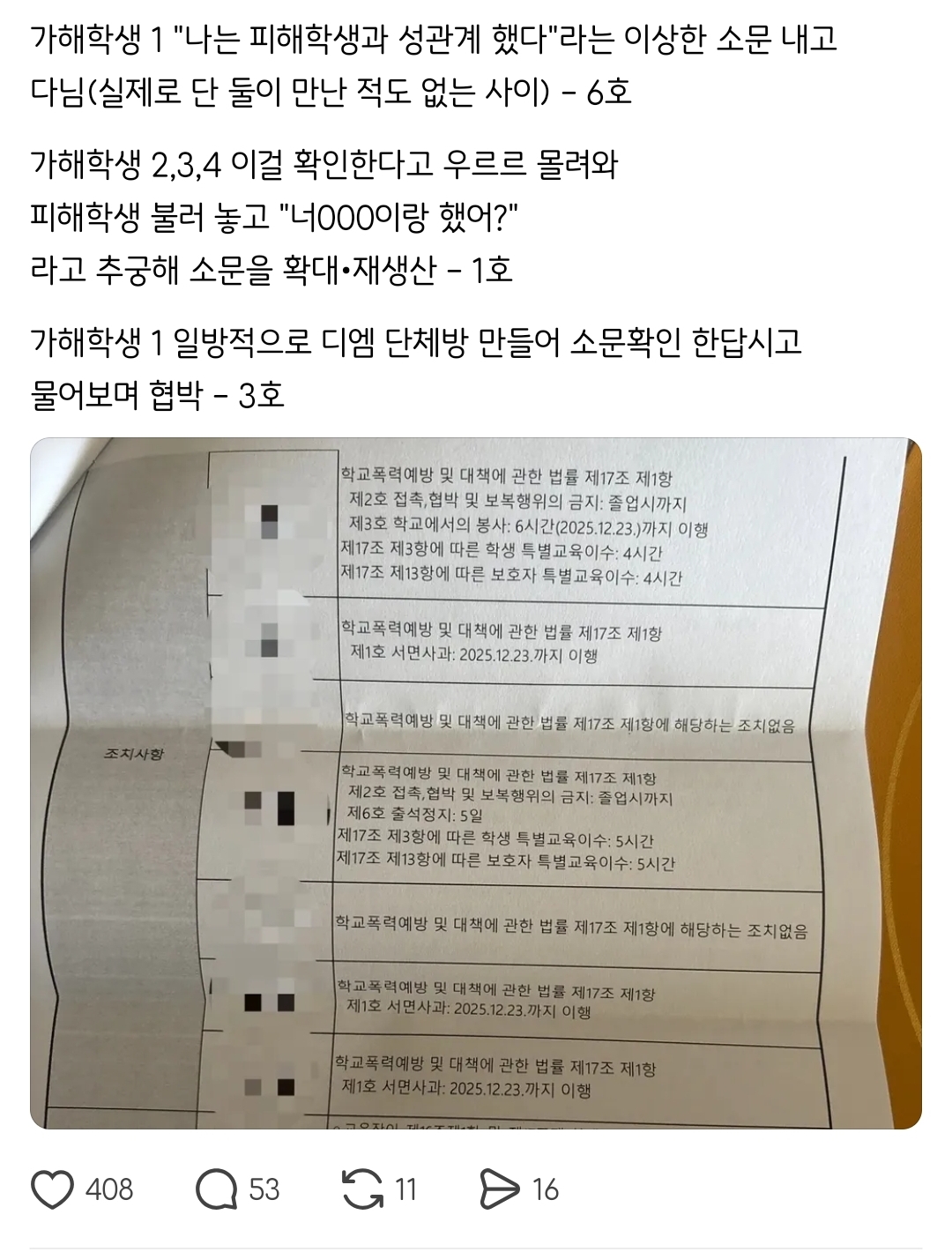 작성자행운핑핑이 작성시간 25.11.02 학폭 조치사항 다 뜯어고쳐야 해!!! 교내봉사 5시간 10시간이 무슨 의미인지, 억지청소인데.. 사회봉사도 기본 60시간정도 하고 빡센데서 해야지. 특별교육은 진짜 제일 필요없는거 같아. 피해자가 받았을 고통만큼 똑같이 느끼게 하고 (본문에 피켓들기처럼 수치심도 느끼게 하고) 부모는 의무로 금전보상 해야하고..
