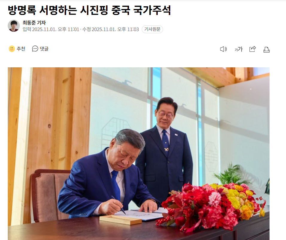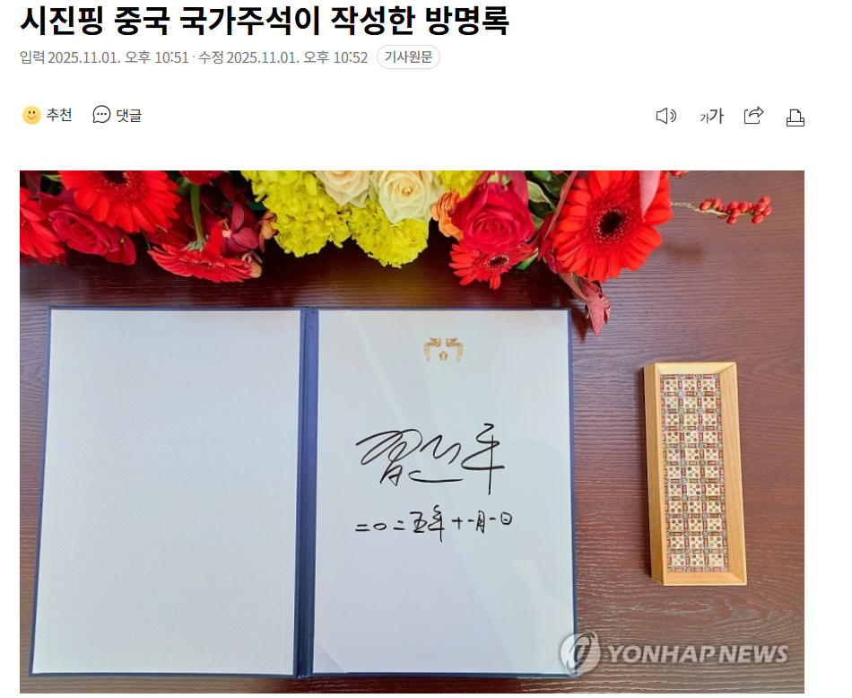 [여시뉴스데스크]시진핑 중국 국가수석이 작성한 방명록 작성자외숙모|작성시간25.11.01|조회수22,651 목록 댓글 46 글자크기 작게가 글자크기 크게가 출처: https://n.news.naver.com/mnews/article/001/0015718580?sid=104시진핑 중국 국가주석이 작성한 방명록시진핑 중국 국가주석이 1일 경북 국립경주박물관에서 열린 공식 환영행사에서 작성한 방명록. 2025.11.1 [대통령실 제공. 재판매 및 DB 금지]n.news.naver.com 다음검색 현재 게시글 추가 기능 열기 북마크 공유하기 신고 센터로 신고 댓글 댓글 46 댓글쓰기 답글쓰기 댓글 리스트 작성자버볼버블 | 작성시간 25.11.02 김선루=ㅇ=b + -A-👊 작성자칙촉푸들 | 작성시간 25.11.02 럽쓰루 작성자피노누아 | 작성시간 25.11.02 누가 진짜 니 언재왓다갓는지 적으래? 센스재기 문맹인가 0을 원래 한자로 적는게 맞나본데.. 작성자air. | 작성시간 25.11.02 집에서 한자노트사서 연습해라 .. 작성자다터져서왔다고요 | 작성시간 25.11.03 저래서 시진핑 글을 모른다는 소문이 엄청 많아 중국에 ㅋㅋㅋㅋ 진짜 칭화대 나온거 맞냐부터,, 댓글 전체보기