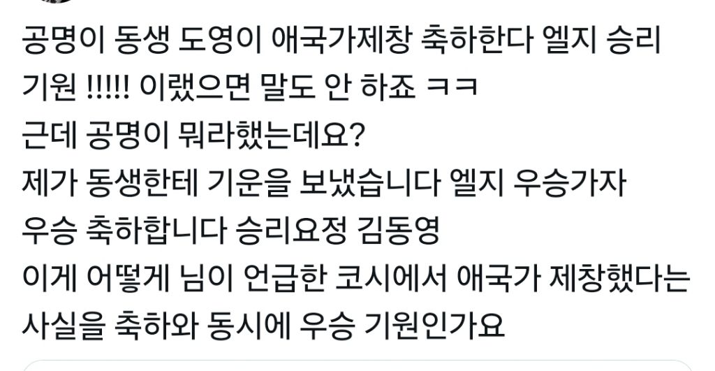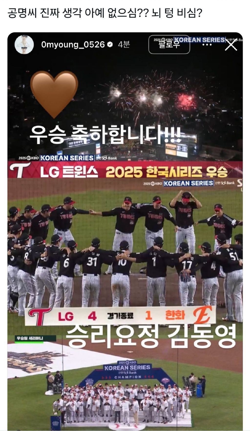이걸 보고 배우 공명(도영의 친형, LG팬으로 유명)이 인스스를 위와 같이 올려서 욕을 먹음(???)