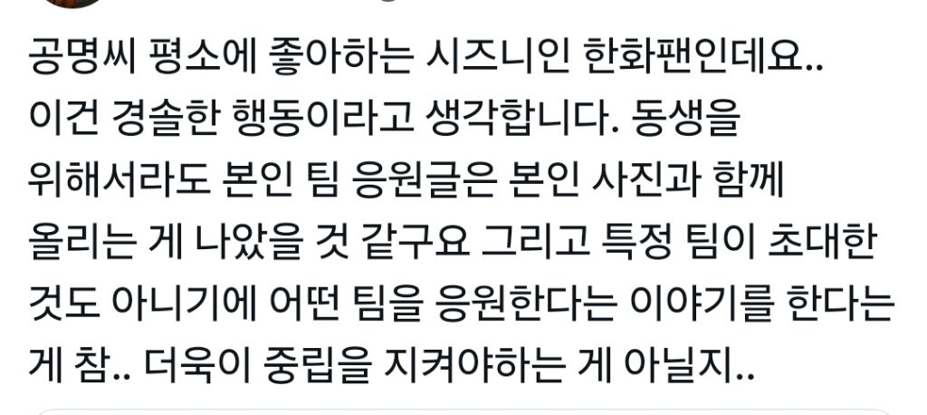 작성자옥토롱 작성시간 25.11.03 부른게 한화도 아니고 크보인데다가, 당사자인 도영이 인스스도 아니고 형이 자기팀 응원한다 한거로 별.... 개 유난이다