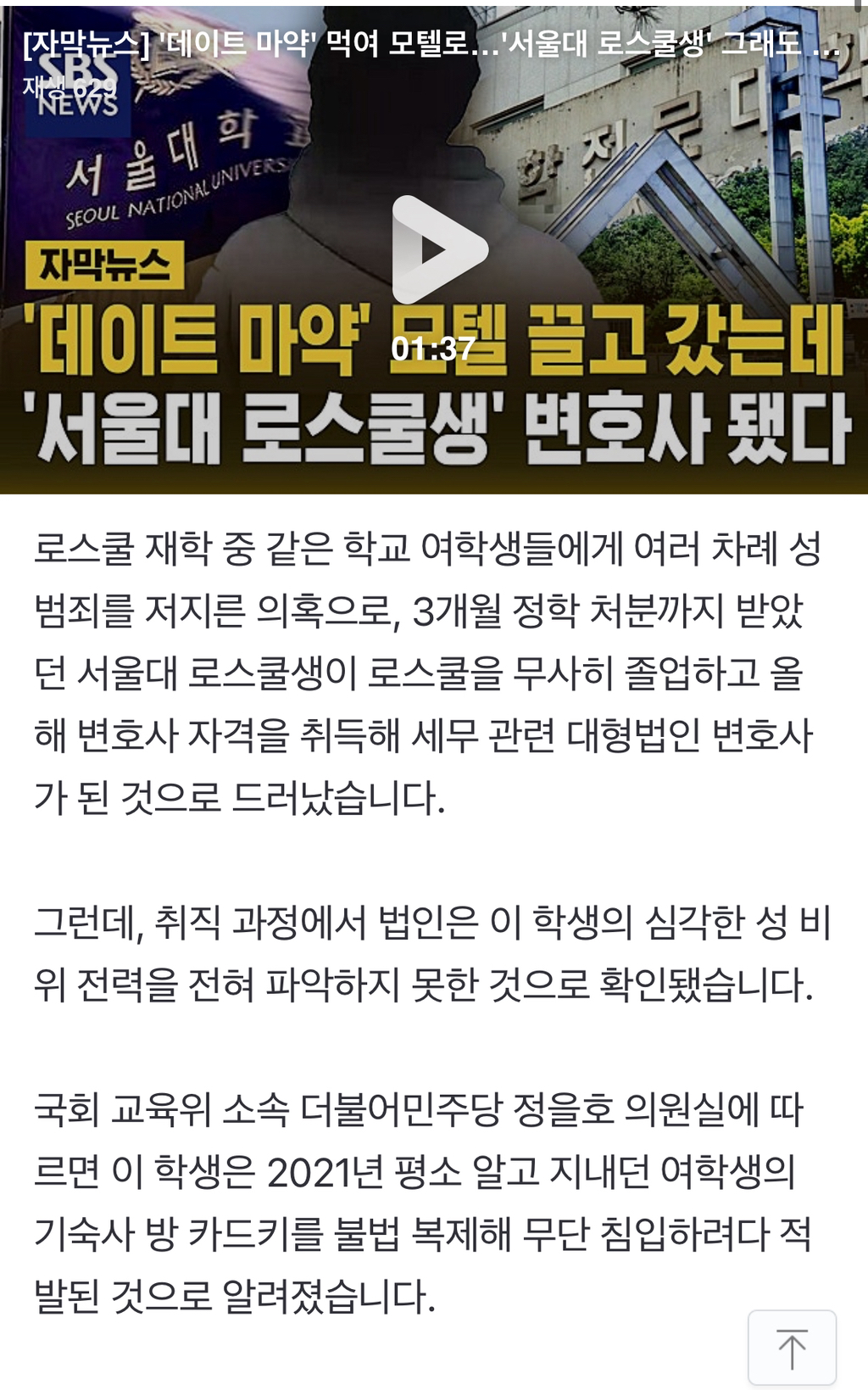 [여시뉴스데스크]‘데이트 마약’ 먹여 모텔로…‘서울대 로스쿨생’ 그래도 변호사 됐다 작성자롱안부멋지셔요|작성시간25.11.02|조회수8,736 목록 댓글 16 글자크기 작게가 글자크기 크게가 출처: https://n.news.naver.com/article/055/0001303409?sid=102[자막뉴스] '데이트 마약' 먹여 모텔로…'서울대 로스쿨생' 그래도 변호사 됐다로스쿨 재학 중 같은 학교 여학생들에게 여러 차례 성범죄를 저지른 의혹으로, 3개월 정학 처분까지 받았던 서울대 로스쿨생이 로스쿨을 무사히 졸업하고 올해 변호사 자격을 취득해 세무 관련 n.news.naver.com 다음검색 현재 게시글 추가 기능 열기 북마크 공유하기 신고 센터로 신고 댓글 댓글 16 댓글쓰기 답글쓰기 댓글 리스트 작성자앙쿠마 | 작성시간 25.11.02 신상이라도 털렸으면 답댓글 작성자앙쿠마 | 작성시간 25.11.02 대형법무법인도 털려라 작성자복동이짱조아 | 작성시간 25.11.02 범죄자가 변호산데 변호를 제대로 어떻게 해…? 작성자오늘은토요일 | 작성시간 25.11.02 미친거아니야 작성자바밤바바밤바뱌 | 작성시간 25.11.02 퇴학 시켰어야지 윤석열학교답다 댓글 전체보기