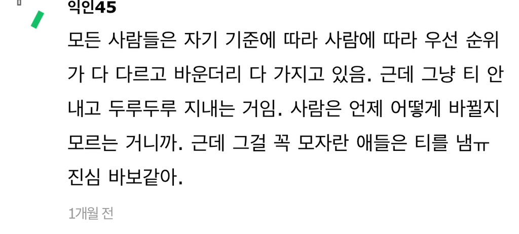 작성자도덕결여 작성시간 25.11.03 내사람.. 염불외우던 친구 그래서 그 바운더리 들어가면 뭐가잇는데?? 라고 얘기하고싶었지만 꾹참음ㅎ 빈대같이 얻어먹기만 하면서 ㅅㅂ ㅋㅋ