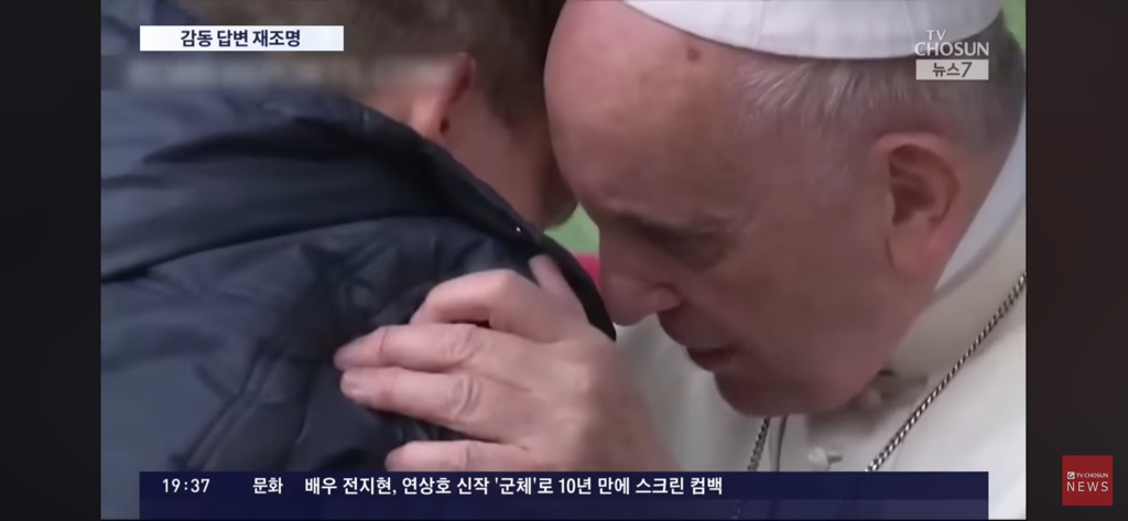 아이는 교황의 품에 안겨 서럽게 울자