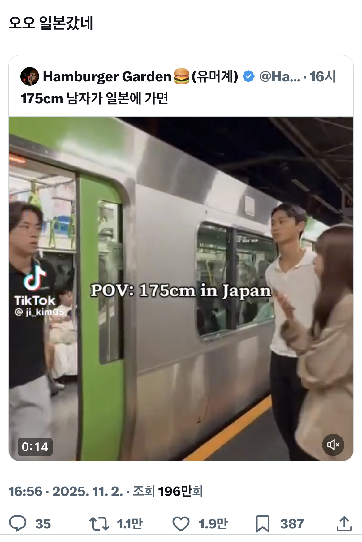 [흥미돋]175cm 남자가 일본에 가면... 작성자투슬릐스|작성시간25.11.03|조회수51,748 목록 댓글 195 글자크기 작게가 글자크기 크게가 출처: https://x.com/gohyangmandyu/status/1984892379342799010?s=46왜찍은거긔 다음검색 현재 게시글 추가 기능 열기 북마크 공유하기 신고 센터로 신고 댓글 댓글 195 댓글쓰기 답글쓰기 댓글 리스트 작성자HEARTS2HEARTS | 작성시간 25.11.04 ㅋㅋ 작성자기린언니 | 작성시간 25.11.04 ㅋ 뒷꿈치 ㅋ 작성자이진 | 작성시간 25.11.04 뭐하냐 작성자묵케 | 작성시간 25.11.04 ㅅㅂ호빗마을 놀러긴 조금큰호빗이잖아 작성자스위치오프 | 작성시간 25.11.14 웩 댓글 전체보기