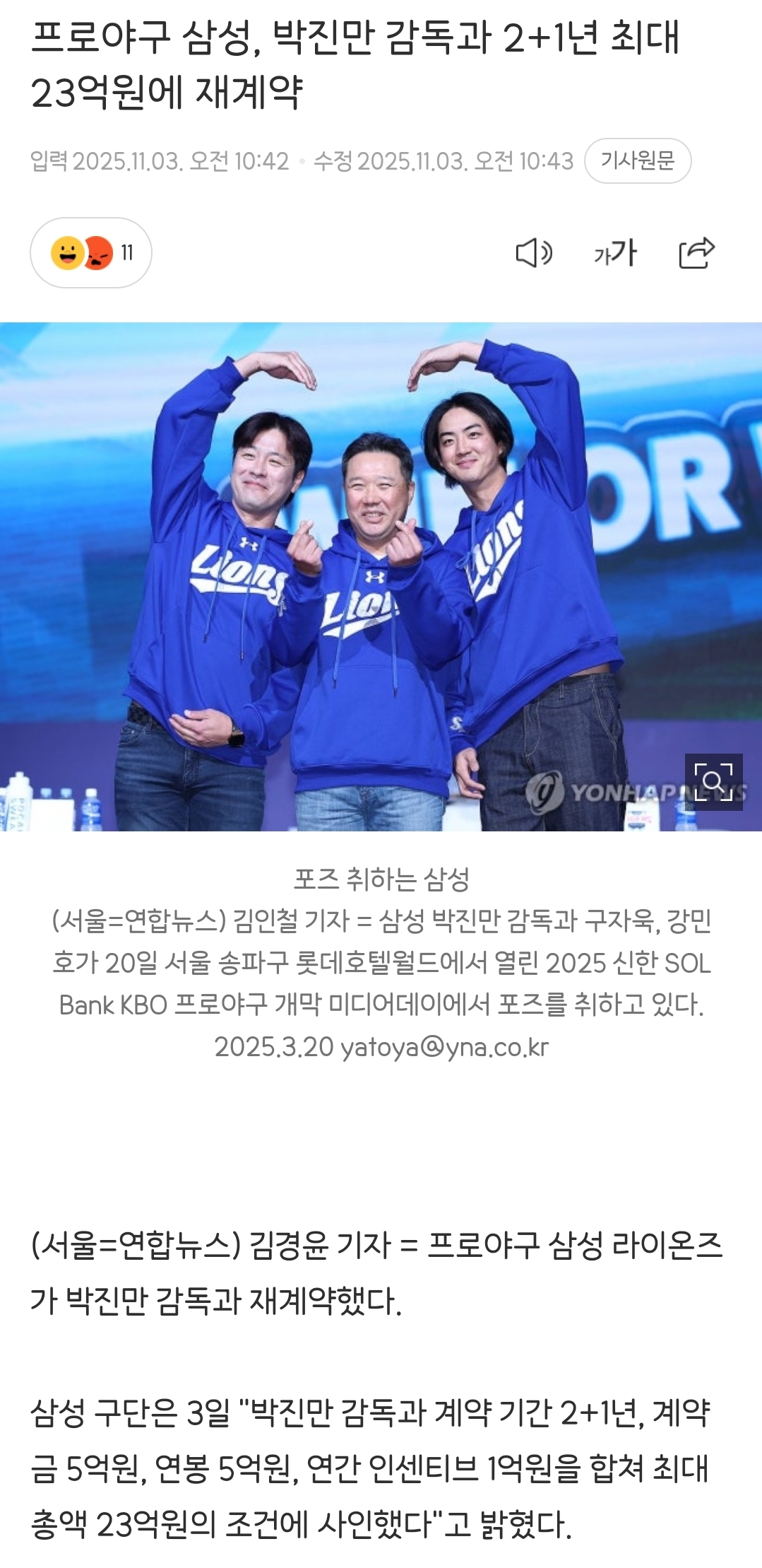 [여시뉴스데스크]프로야구 삼성, 박진만 감독과 2+1년 최대 23억원에 재계약 작성자팟즈|작성시간25.11.03|조회수6,696 목록 댓글 74 글자크기 작게가 글자크기 크게가 출처: 여성시대 팟즈https://m.sports.naver.com/kbaseball/article/001/0015720215프로야구 삼성, 박진만 감독과 2+1년 최대 23억원에 재계약여기를 눌러 링크를 확인하세요m.sports.naver.com 다음검색 현재 게시글 추가 기능 열기 북마크 공유하기 신고 센터로 신고 댓글 댓글 74 댓글쓰기 답글쓰기 댓글 리스트 작성자죠르디딛 | 작성시간 25.11.03 만두우승함가자!!!! 작성자born in blue_ | 작성시간 25.11.03 만두야~~~~~~~~~ 가보자고~~~ 작성자은하수반짝 | 작성시간 25.11.03 만두 기다리고 있었다ㅠㅠㅠㅠ캬 작성자Born ln Blue | 작성시간 25.11.03 만두 굿 작성자이호범 | 작성시간 25.11.03 댓글 전체보기