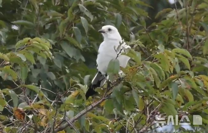 [제주=뉴시스] 지난달 31일 제주시 오등동 한 과수원에서 털이 하얀 까치가 발견됐다. (사진=다큐제주 오승목 감독 제공) 2025.11.03. photo@newsis.com[제주=뉴시스] 오영재 기자 = 제주에서 털이 하얀 까치가 발견됐다.