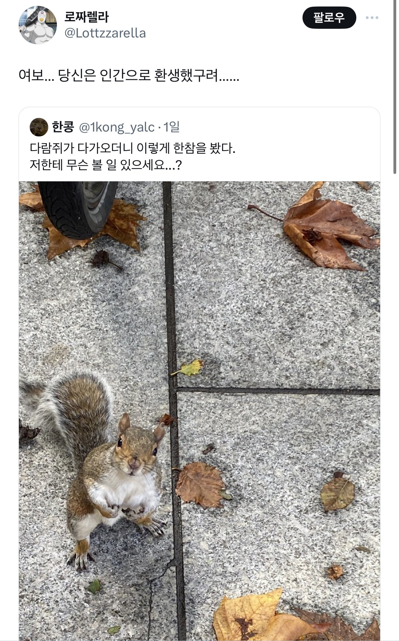 [흥미돋]여보… 당신은 인간으로 환생했구려…… 작성자바나나스플릿구슬|작성시간25.11.03|조회수77,056 목록 댓글 27 글자크기 작게가 글자크기 크게가 출처: https://x.com/lottzzarella/status/1984732183953854512?s=46&t=v7QMmEln8v7WsADFKYn65g이번 생은 인간으로 환생했구려 다음검색 현재 게시글 추가 기능 열기 북마크 공유하기 신고 센터로 신고 댓글 댓글 27 댓글쓰기 답글쓰기 댓글 리스트 작성자안아프고 행복한 부자 | 작성시간 25.11.03 전나 축 쳐진 어깨가 너머 슬퍼보여요 작성자출근노노핑 | 작성시간 25.11.03 ㅜㅜㅜㅜㅜ 작성자암국 | 작성시간 25.11.04 왤케 아련하게 봐ㅜ 작성자코코롱코롱 | 작성시간 25.11.04 ㅋㅋㅋㅋㅋㅋㅋㅋㅋㅋㅋㅋㅋㅋㅋㅋㅋㅋ아 귀여워 작성자하이마마 | 작성시간 25.11.04 너 왜 나를 그렇게 쳐다봐ㅋㅋㅋㅋㅋㅋ 댓글 전체보기