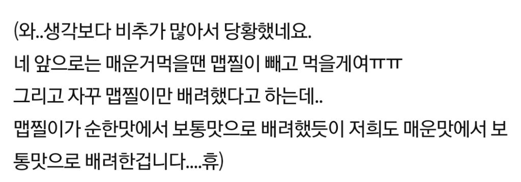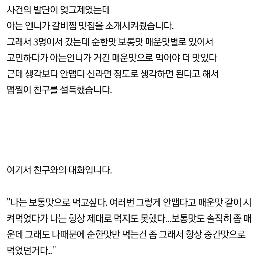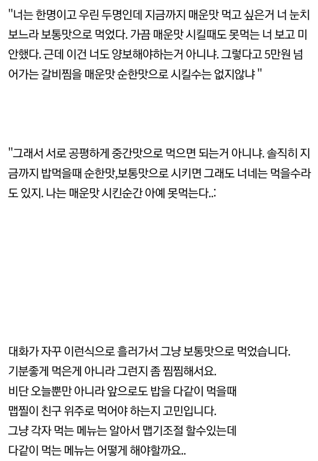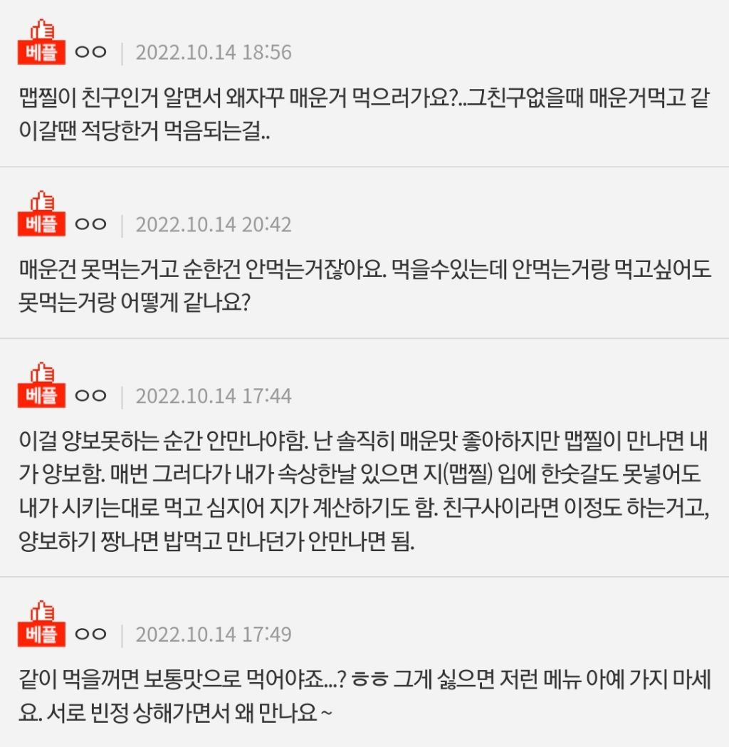 [흥미돋]맵찔이한테 꼭 양보를 해줘야 하나요? 작성자주미사미|작성시간25.11.03|조회수16,864 목록 댓글 102 글자크기 작게가 글자크기 크게가 출처: 여성시대 주미사미 http://zul.im/0OwOqn맵찔이한테 꼭 양보를 해줘야 하나요? | 네이트 판결혼/시집/친정 - 꼭조언부탁 : 일단 방탈죄송합니다. 현실조언을 구하고자 여기에 글을 쓰게 됐어요. 같이 다니는 3명의 친구가 있는데, 이중 한명이 맵찔이입니다. 저와 다른 친구는 매운걸 좋pann.nate.com+ 다음검색 현재 게시글 추가 기능 열기 북마크 공유하기 신고 센터로 신고 댓글 댓글 102 댓글쓰기 답글쓰기 댓글 리스트 작성자나무위소총든고양이 | 작성시간 25.11.04 뭐지 ㅋㅋㅋㅋㅋㅋ 중간맛 시키고 매운소스 달라하면 되지.. 작성자럭키빗츼 | 작성시간 25.11.04 심보 고약하네 작성자햄스터제왕 | 작성시간 25.11.04 아 둘이가라고 작성자박문댕 | 작성시간 25.11.04 맵찔이는 매운거먹으면 맛이 아니라 몸이 아프다고요.....나도 매운거 먹고싶어 근데 매운거 먹으면 위장, 이목구비 아프다고요.... 작성자동규라니 | 작성시간 25.11.05 저것도 친구라고... 댓글 전체보기