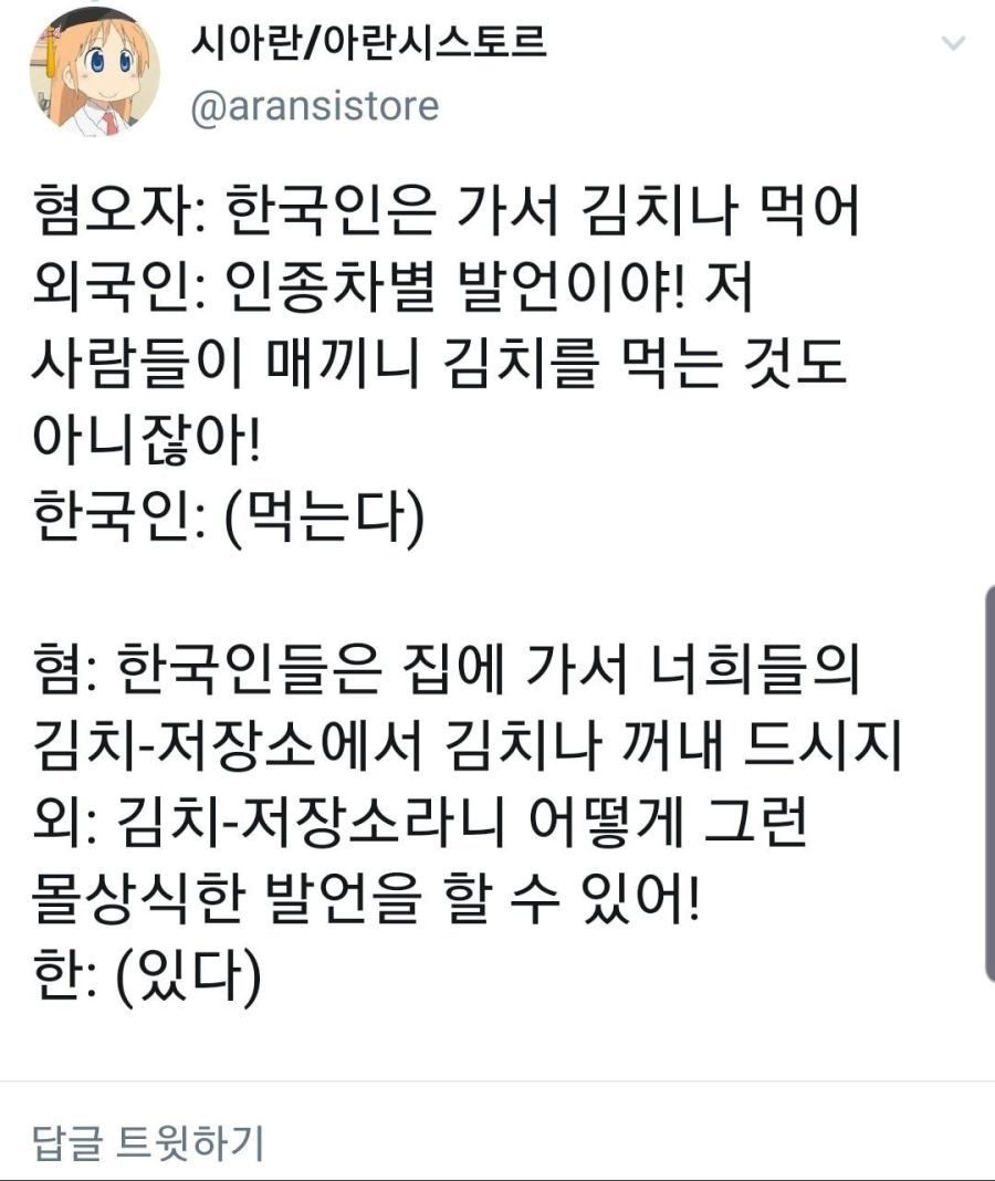 작성자R=vd 로또1등 작성시간 25.11.04 진지하게 저게 왜 몰상식한 말이여? 김치 저장소 = 냉장고아니야? 일본한테 너네 냉장고에서 나또나 꺼내 드시지! 이런거나 똑같은 거 아니야?