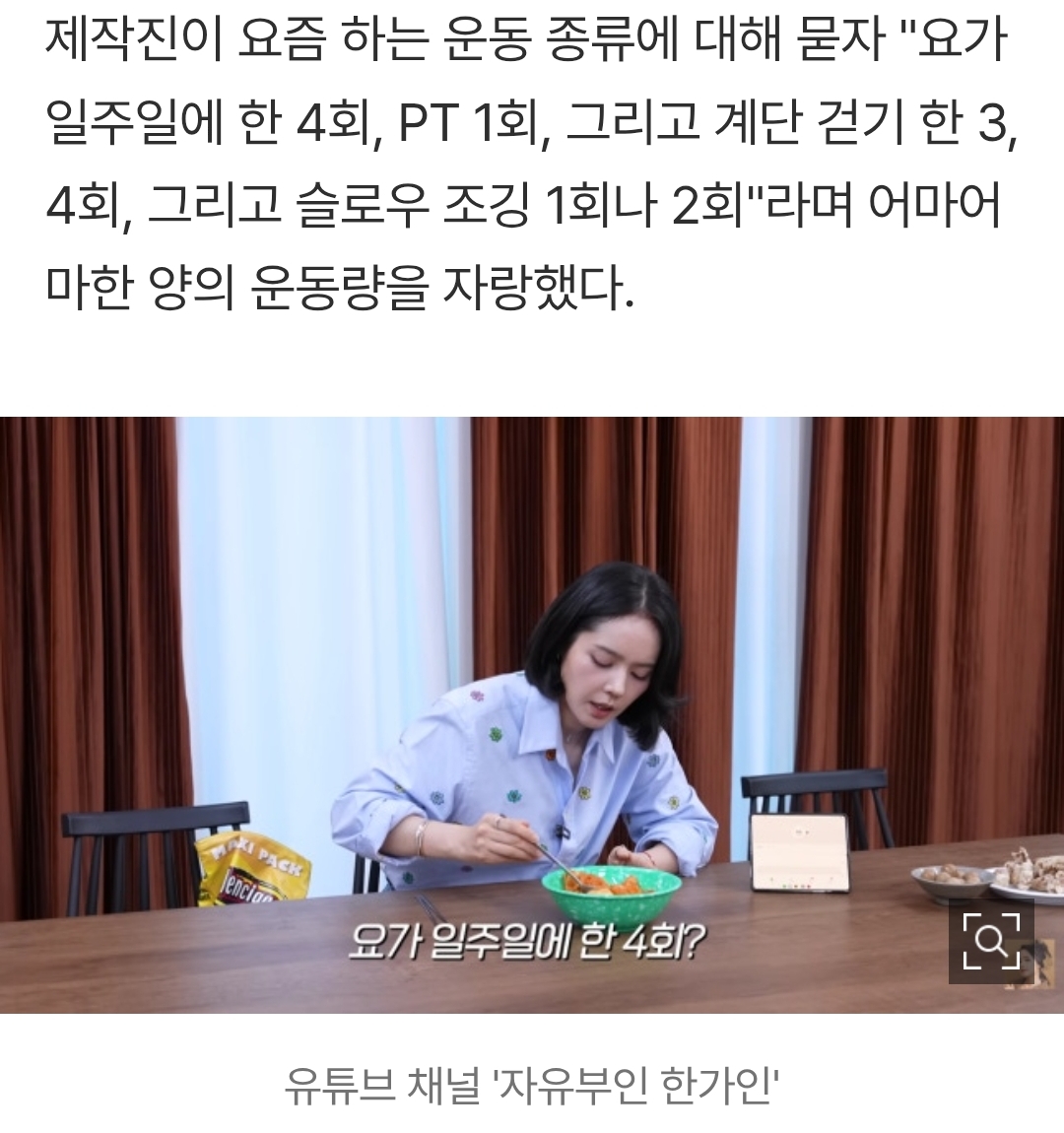 [흥미돋]한가인 운동량 - 요가 일주일에 4회, PT 1회, 계단 걷기 3~4회, 슬로우 조깅 1~2회