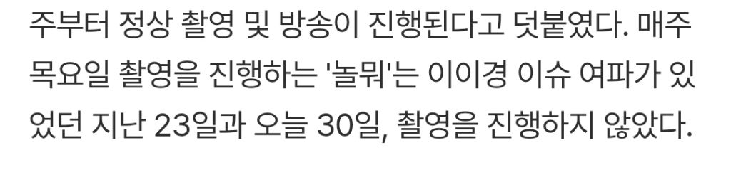 드라마 영화촬영 문제로 하차 나는 솔로 용감한 형사들 등 다른 예능은 그대로 출연함 사건 이후에 놀뭐 복귀후 촬영했다고 트위터에서 욕 무지하게 먹었는데 2주간 촬영 안했다고함 (지난주는 결방이고 지지난주는 논란 전 촬영분)