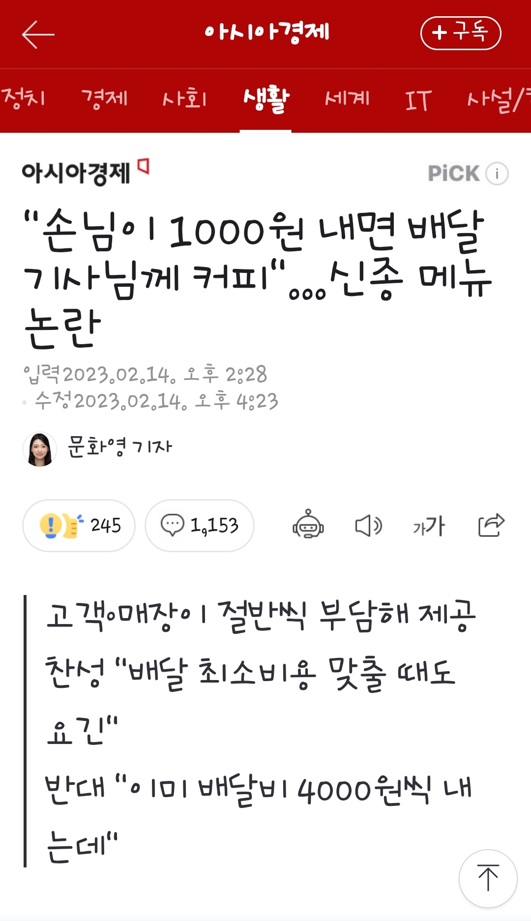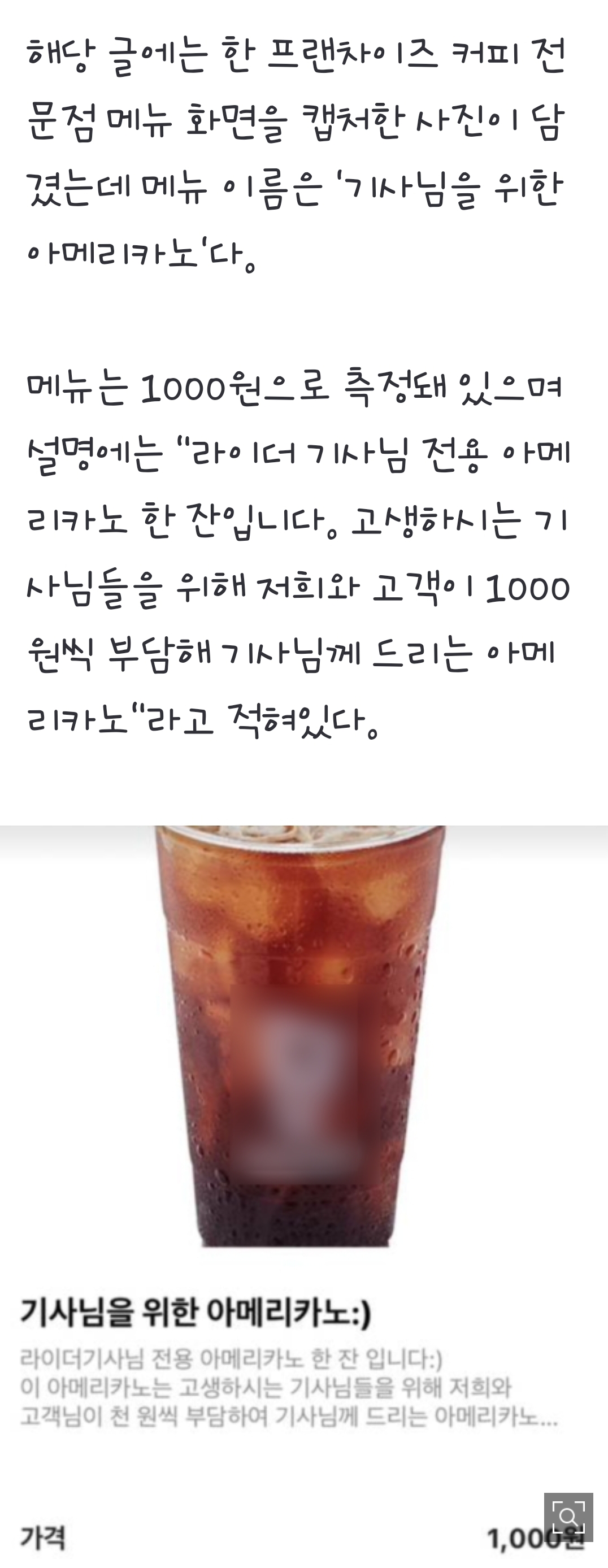 [스크랩] [기타]"손님이 1000원 내면 배달기사님께 커피"…신종 메뉴 논란 작성자계절 틈에 잠시 피는 낯선꽃처럼|작성시간25.11.04|조회수26,101 목록 댓글 68 글자크기 작게가 글자크기 크게가 출처 : https://naver.me/FiEfTzEj"손님이 1000원 내면 배달기사님께 커피"…신종 메뉴 논란한 프랜차이즈 커피 전문점에서 메뉴에 '배달 기사를 위한 커피'를 내놓자 소비자들 사이에서 갑론을박이 펼쳐지고 있다. 최근 한 온라인 커뮤니티에는 '커피 배달시킬 때 이런 메뉴 1000원이면 n.news.naver.com 다음검색 스크랩 원문 : *여성시대* 차분한 20대들의 알흠다운 공간 현재 게시글 추가 기능 열기 북마크 공유하기 신고 센터로 신고 댓글 댓글 68 댓글쓰기 답글쓰기 댓글 리스트 작성자뉘기니 | 작성시간 25.11.04 신종지랄인가 작성자딥치즈 베이컨 포테이토 | 작성시간 25.11.04 뭐 공짜로 배달해?ㅋㅋㅋㅋㅋㅋㅌ남미새들 ㄲㅈ 작성자Young Adult | 작성시간 25.11.04 개오바 기사도 마시기 싫을수도 있는데 ㅋㅋ 작성자홈런볼런홈 | 작성시간 25.11.04 공짜로 배달하냐고 ㅎ 작성자월화수토일일일 | 작성시간 25.11.05 ㅋㅋㅋㅋ 댓글 전체보기
