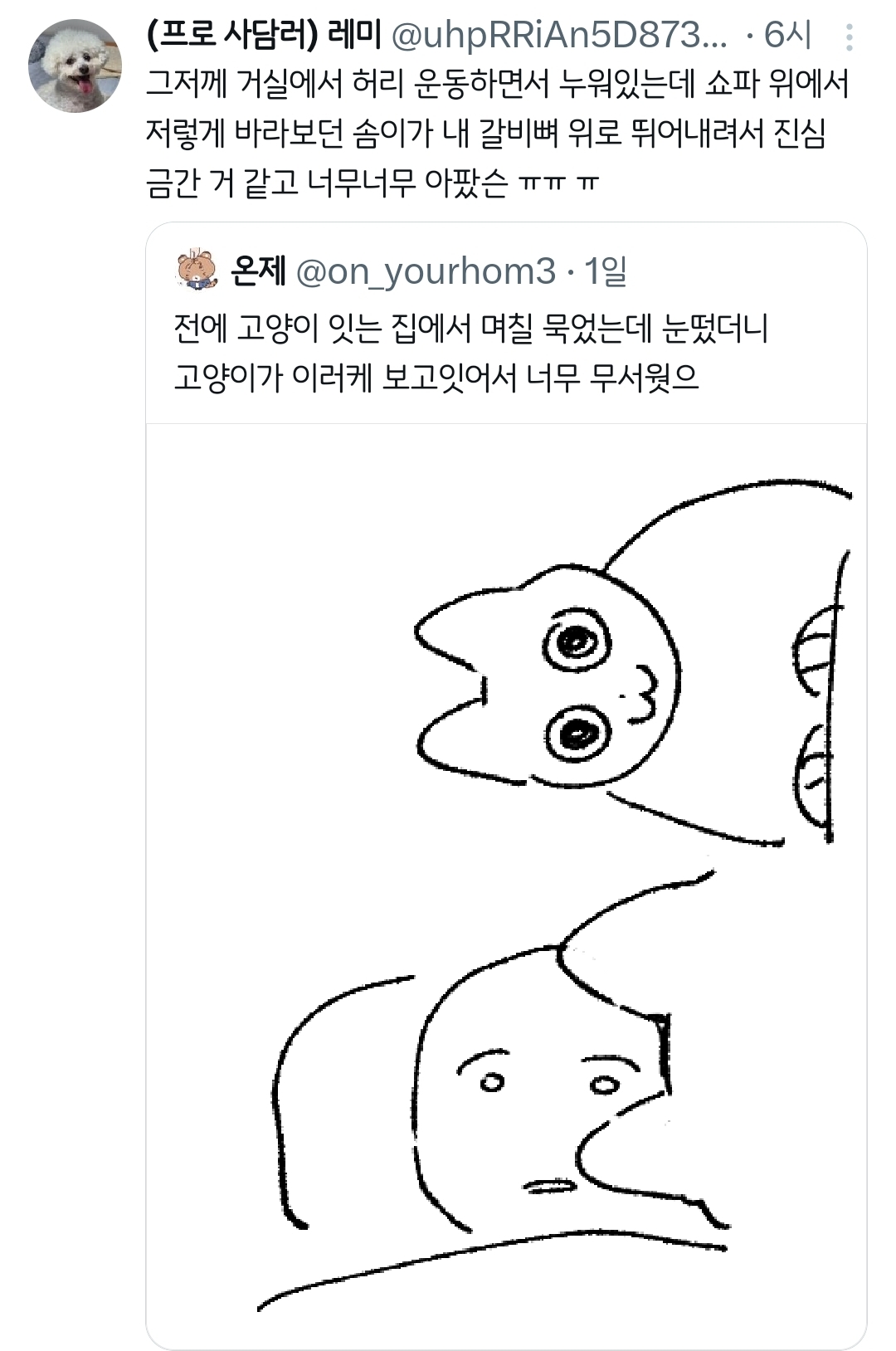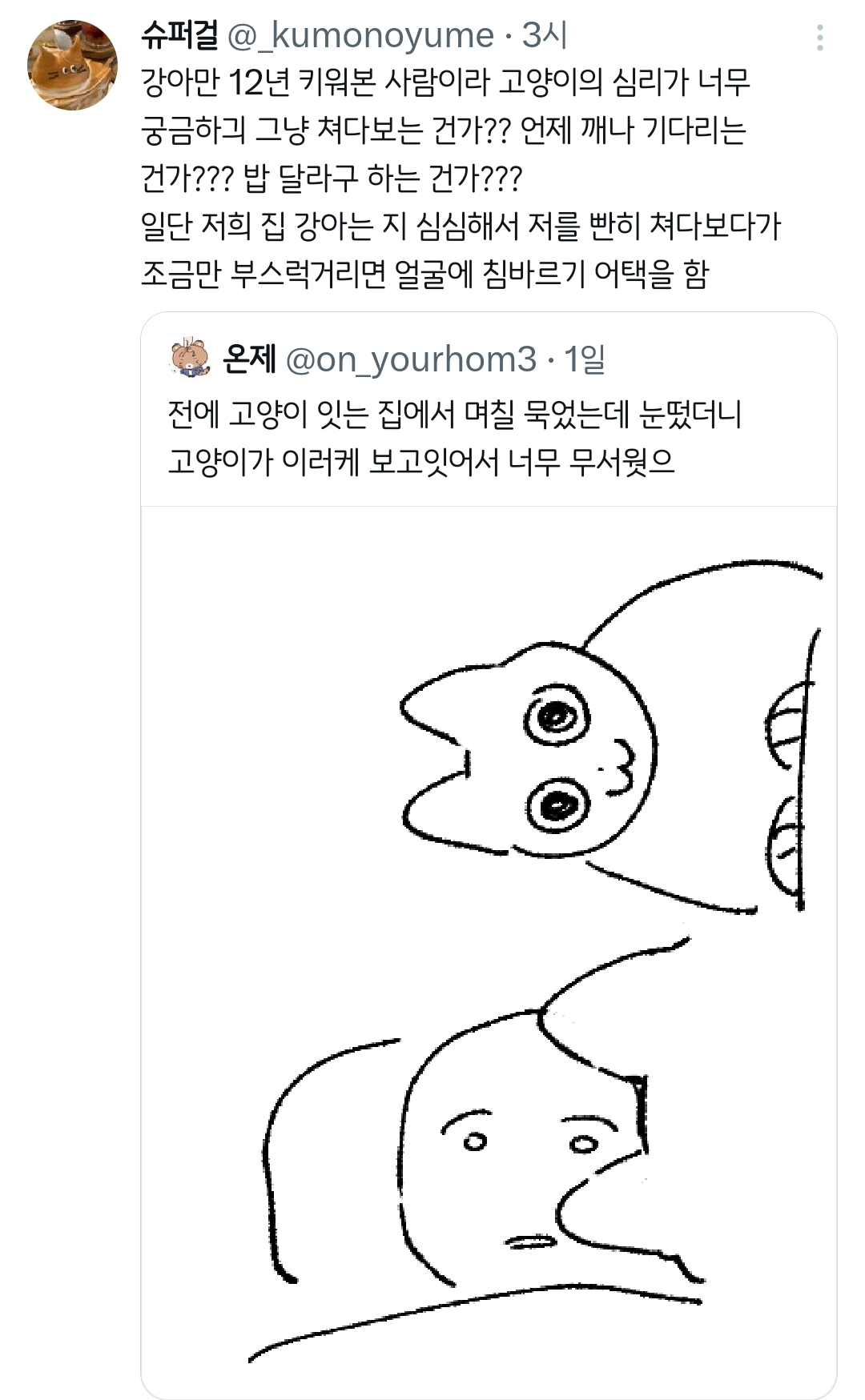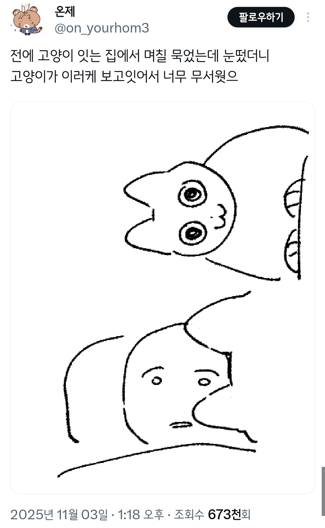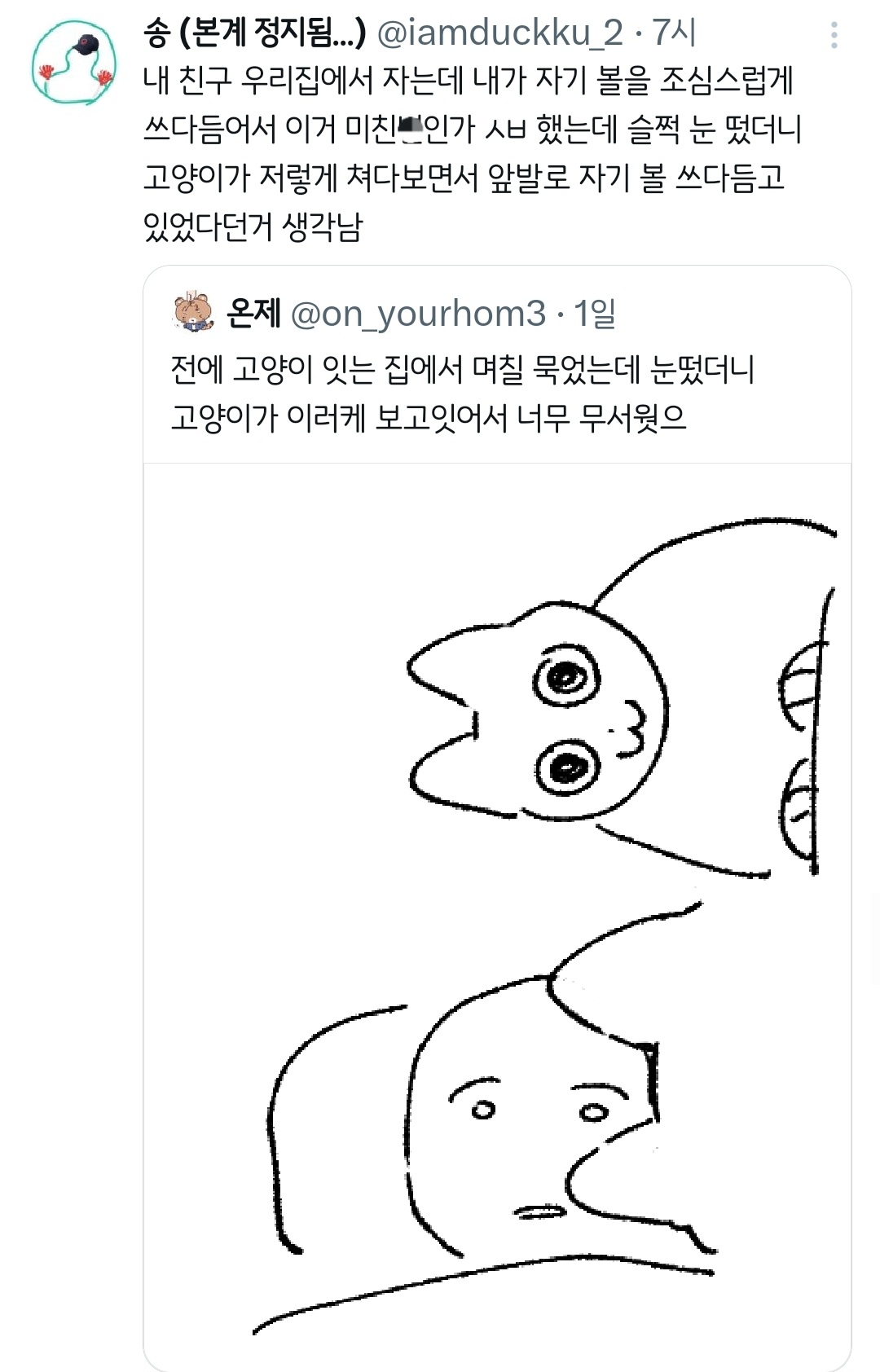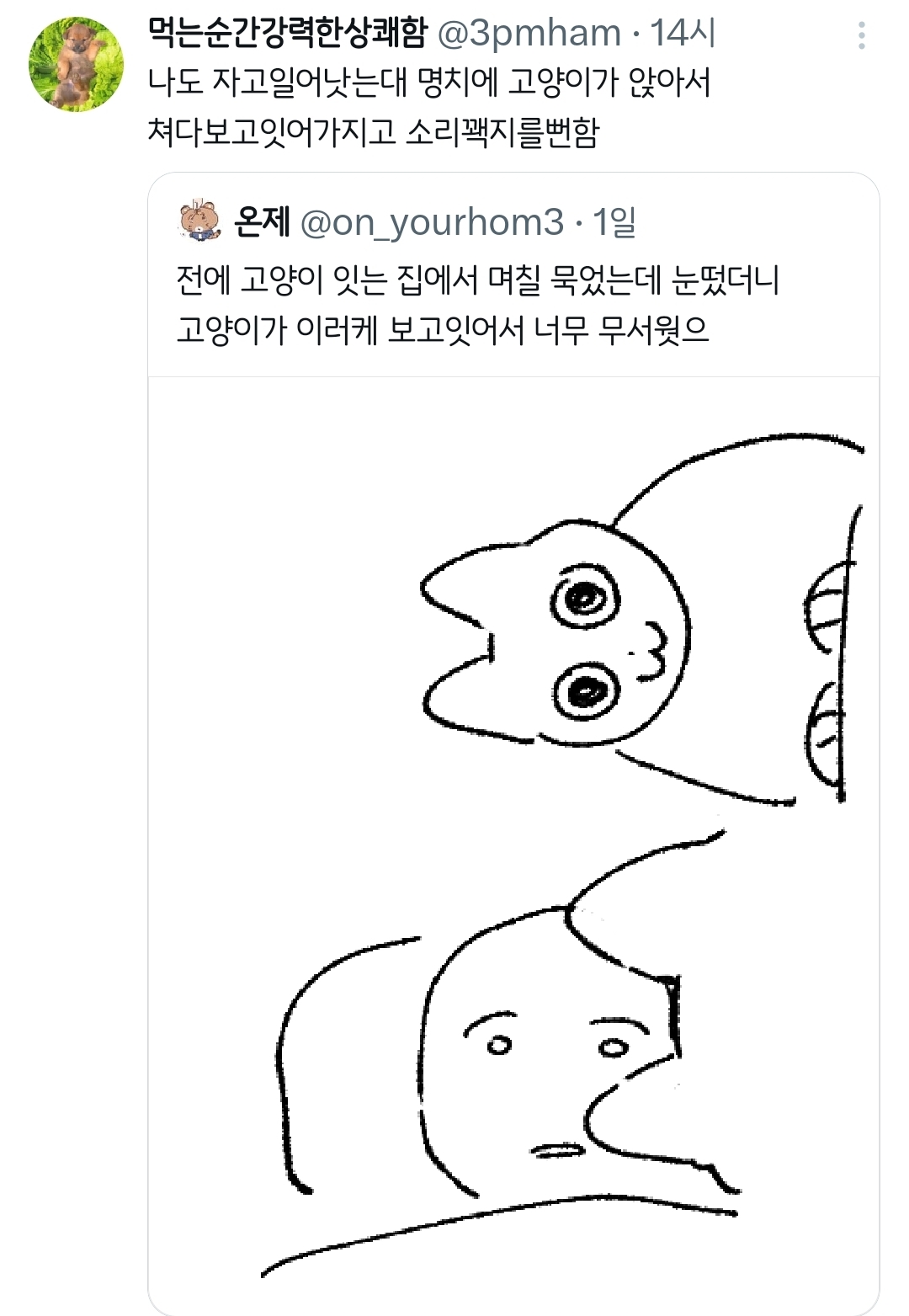 작성시간 25.11.05 나도 친구집에서 자다 새벽에 시선이 느껴져 눈을 뜨니 고양이 둘이서 쳐다보고있는거야