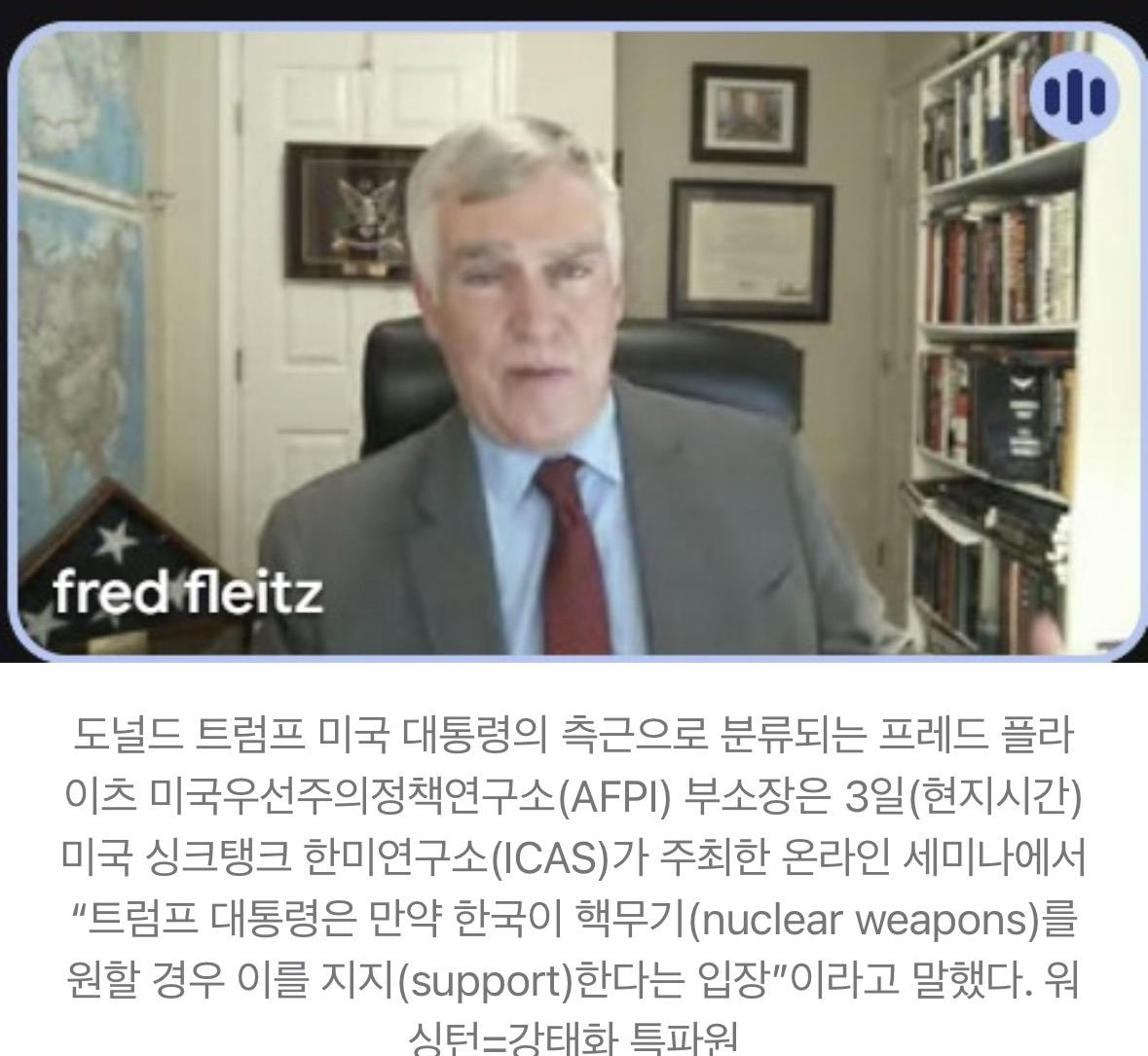 도널드 트럼프 미국 대통령의 측근으로 분류되는 프레드 플라이츠 미국우선주의정책연구소(AFPI) 부소장은 3일(현지시간) “트럼프 대통령은 만약 한국이 핵무기(nuclear weapons)를 원할 경우 이를 지지(support)한다는 입장”이라고 말했다. 플라이츠 부소장은 트럼프 1기 행정부에서 백악관 국가안보회의(NSC) 비서실장을 지낸 인물이다.